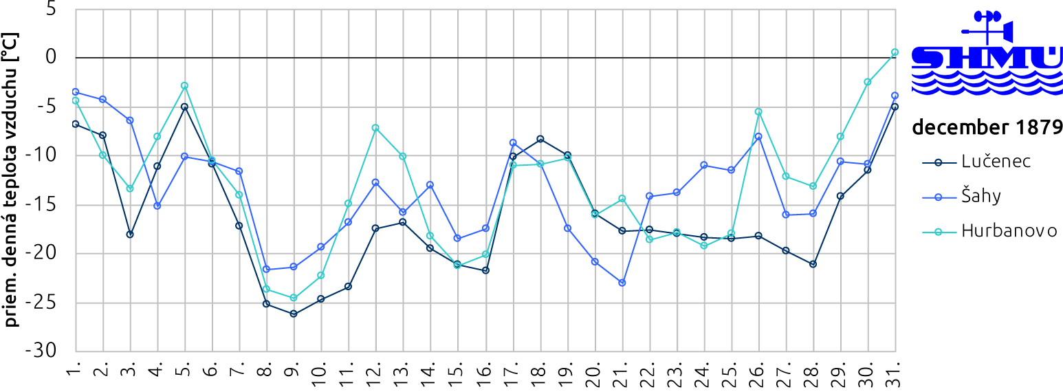 Na meteorologickej stanici v Hurbanove s priemernou mesačnou teplotou vzduchu -13,0 °C (čo pre túto stanicu predstavuje odchýlku -13,4 °C od klimatologického normálu pre mesiac december za obdobie rokov 1961-1990) mrzlo nepretržite takmer celý kalendárny mesiac (celodenné mrazy, t.j. ľadové dni začali už 27. novembra 1879) a teplota vzduchu sa tu prvýkrát dostala na a nad nulu až 30. decembra. Najnižšie okamžité minimum teploty vzduchu v rámci mesiaca dosiahlo -29,8 °C, čo je až dodnes najsilnejší decembrový mráz evidovaný na tejto poprednej slovenskej meteorologickej stanici minimálne od roku 1871.