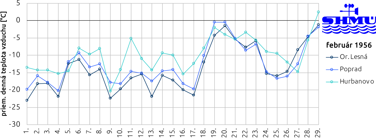 V pozoruhodnom februári 1956 bola ústrednou oblasťou s výskytom najnižšej priemernej mesačnej teploty vzduchu Horná Orava (obr. 4 a tab. 1). Hodnota uvedenej charakteristiky bola na rade tamojších meteorologických staníc menej než -13,5 °C; v lokalite Slaná voda nad obcou Oravská Polhora to bolo až -14,0 °C. Aj v tomto prípade dopĺňame, že v rámci popisovaného studeného mesiaca sa v niektorých dňoch na Slovensku vyskytol mráz s poklesom teploty vzduchu pod -30 °C (vybrané mesačné minimá teploty vzduchu za február 1956: Železnô -34,6 °C; Oravská Polhora-Slaná voda -34,0 °C; atď.).