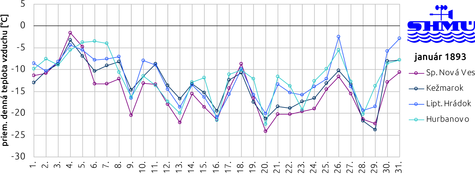 Ďalším legendárnym studeným mesiacom ešte v 19. storočí bol január 1893 (obr. 3). Najciteľnejšie počas neho mrzlo na Spiši: v Spišskej Novej Vsi bola priemerná mesačná teplota vzduchu -15,2 °C a v Kežmarku -13,4 °C. V oboch prípadoch sú dobové záznamy z meteorologických pozorovaní mimoriadne kvalitné - zaslúžili sa o ne tamojší renomovaní učitelia prof. Gustáv Július Geyer (Gyula Gusztáv Geyer), resp. Matej Loisch (Mátyás Loysch). Zhodne -12,0 °C bola hodnota priemernej mesačnej teploty vzduchu za január 1893 v Liptovskom Hrádku aj Hurbanove (odchýlka -7,2 °C, resp. -10,5 °C od normálu 1961-1990). V bezmála 150-ročnom kontinuálnom hurbanovskom časovom rade teploty vzduchu ide pritom o do súčasnosti najstudenší január a druhý najstudenší zo všetkých mesiacov z pohľadu zaregistrovanej hodnoty priemernej mesačnej teploty vzduchu. V Hurbanove v januári 1893 ustavične mrzlo prakticky celý mesiac a mesačné okamžité maximum teploty vzduchu +0,1 °C bolo dosiahnuté až v úplne posledný januárový deň.