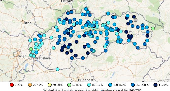 Máj 2021 sa vzhľadom na hydrologickú situáciu prejavil ako nadpriemerne vodný (obr. 1). Po hydrologicky podnormálnej situácii v obvykle vodných mesiacoch marec a apríl sa v máji prietoky v povrchových tokoch dostali nad úroveň dlhodobých priemerných mesačných prietokov (Qma) za referenčné obdobie 1961-2000 vo väčšine vodomerných staníc. Táto situácia nastala najmä vďaka nadnormálnym až silne nadnormálnym zrážkam (pozri Klimatologické hodnotenie mesiaca máj) a v niektorých horských oblastiach ešte aj vďaka topiacemu sa snehu. Hodnoty priemerných mesačných prietokov v máji vo väčšine hodnotených vodomerných staníc (VS) odpovedali rozmedziam 120-160 % Qma, 160-200 % Qma, až viac ako 200 % Qma. V strednej časti Slovenska (horné časti povodí Váh, Hron, Poprad), ale najmä na JZ Slovenska (oblasť Karpát) sa hodnoty pohybovali na úrovni priemerných hodnôt(rozmedzie 80-120 % Qma).