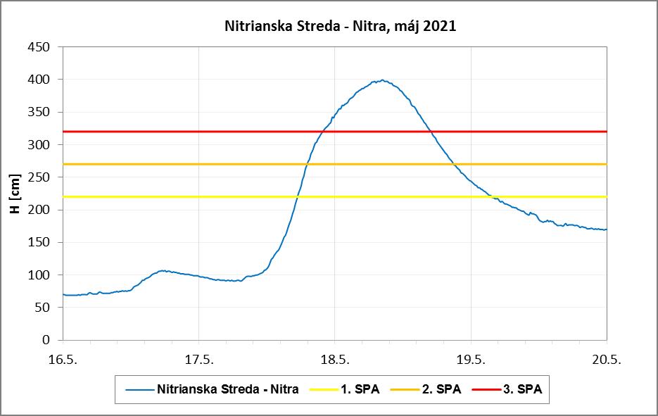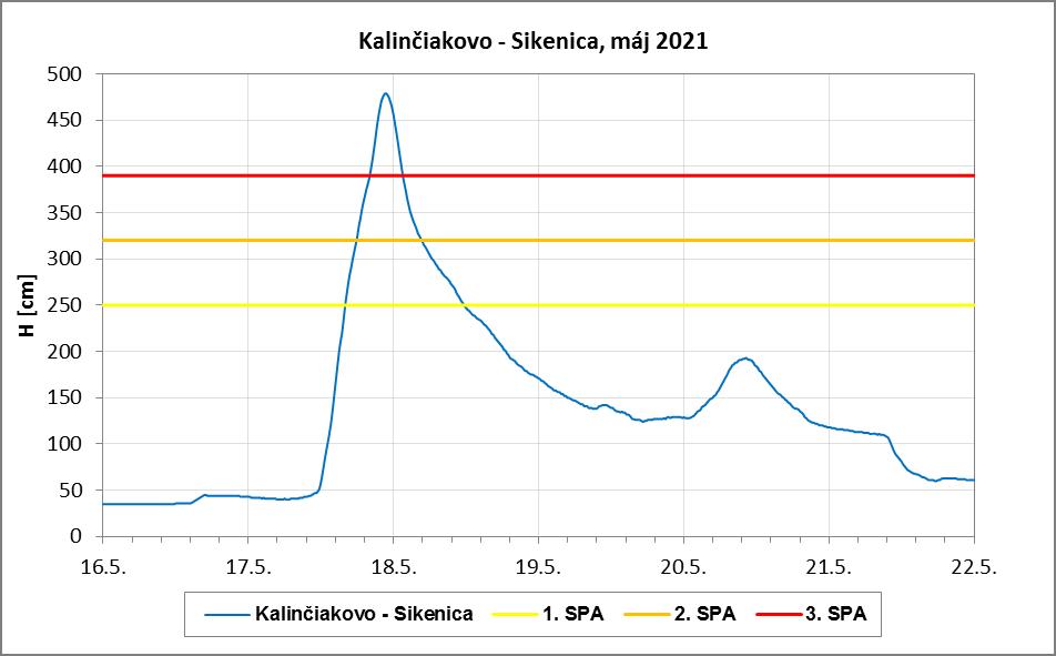 Vodné toky vo väčšine povodí reagovali výraznými vzostupmi a postupne boli dosiahnuté a prekročené 1. až 3. SPA vo viacerých vodomerných staniciach. V priebehu neskorých popoludňajších a večerných hodín, ako aj nasledujúci deň (utorok 18.5.) boli dosiahnuté a prekročené 1. až 3. SPA na viac ako 100 vodomerných staniciach súčasne. Najhoršia povodňová situácia bola v povodí Nitry, Žitavy, horného a stredného Váhu, Hrona, dolného Ipľa (čiastočne aj v ostatných povodiach) a o deň neskôr najmä v povodiach východného Slovenska. Najvýznamnejšie kulminačné prietoky boli dosiahnuté vo vodomerných staniciach: Zlaté Moravce (Hostiansky p.) a Nitrianska Streda (Nitra) na úrovni 50-ročného prietoku (obr. 4). Rieka Nitra vo vodomernej stanici Nové Zámky kulminovala na úrovni 20-ročného prietoku, rovnako aj Sikenica vo vodomernej stanici Kalinčiakovo, okres Levice (obr. 5). Hydrologická situácia sa v ďalších dňoch upokojila a po zvyšok mesiaca prevládal na tokoch pokles vodných hladín, hoci aj naďalej pretrvávalo vlhké počasie.