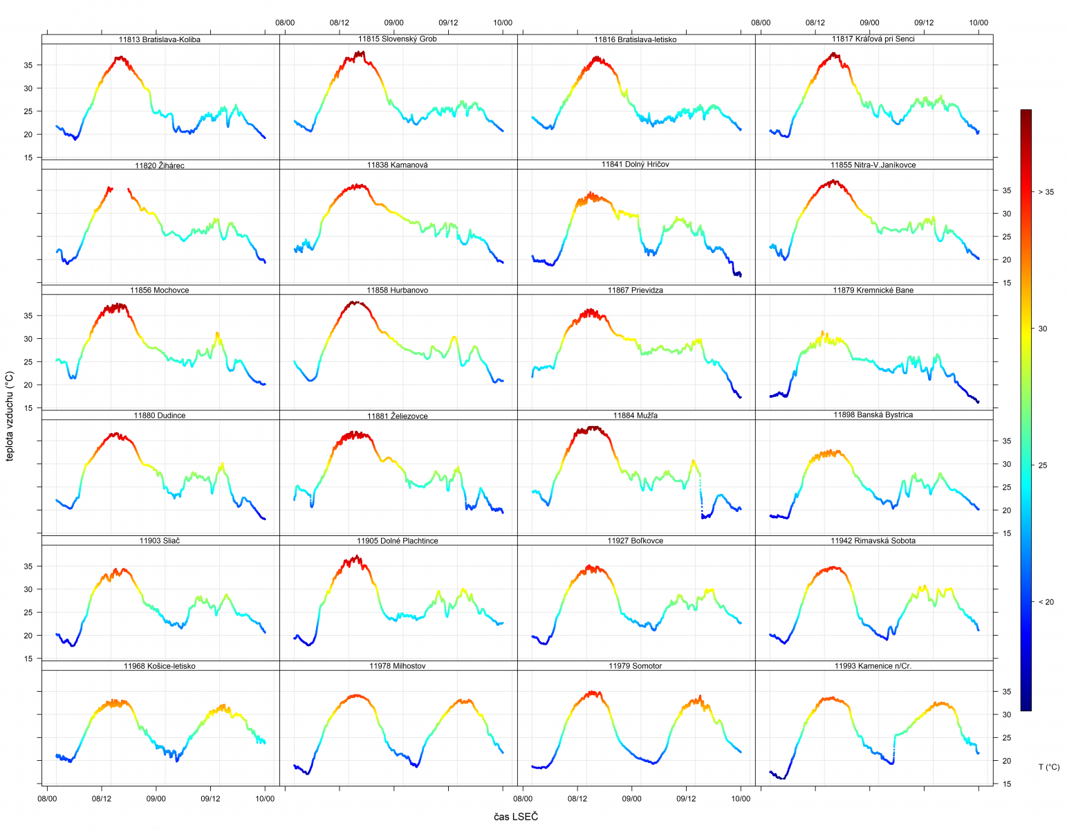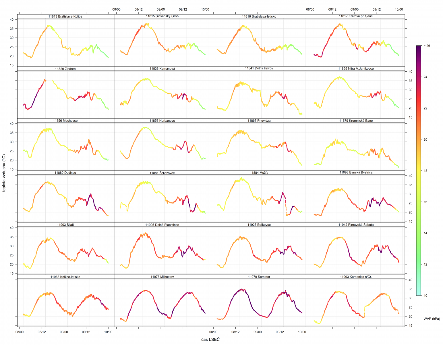 ▲ Obr. 3: Priebeh teploty vzduchu (os y) a tlaku vodnej pary (farebná škála) na vybraných meteorologických staniciach (automatické merania) na Slovensku 8. a 9. júla 2021.