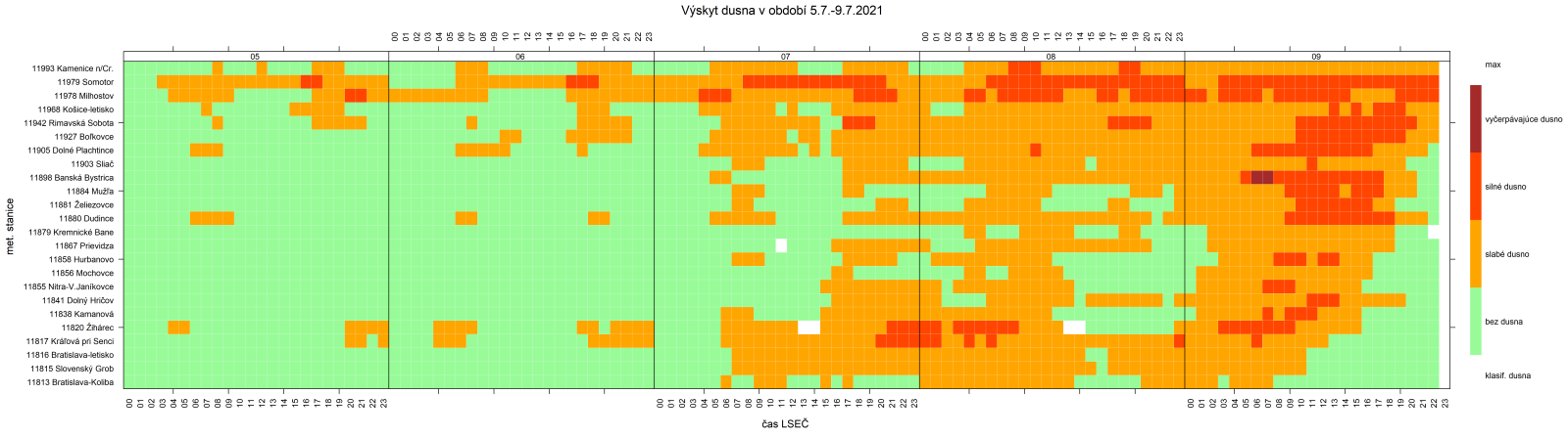 ▲ Obr. 2: Porovnanie výskytu dusna (kategorizované) na vybraných meteorologických staniciach na Slovensku počas vrcholenia horúčav 21. – 25. júna 2021 (hore) a 5. – 9. júla 2021 (dole).