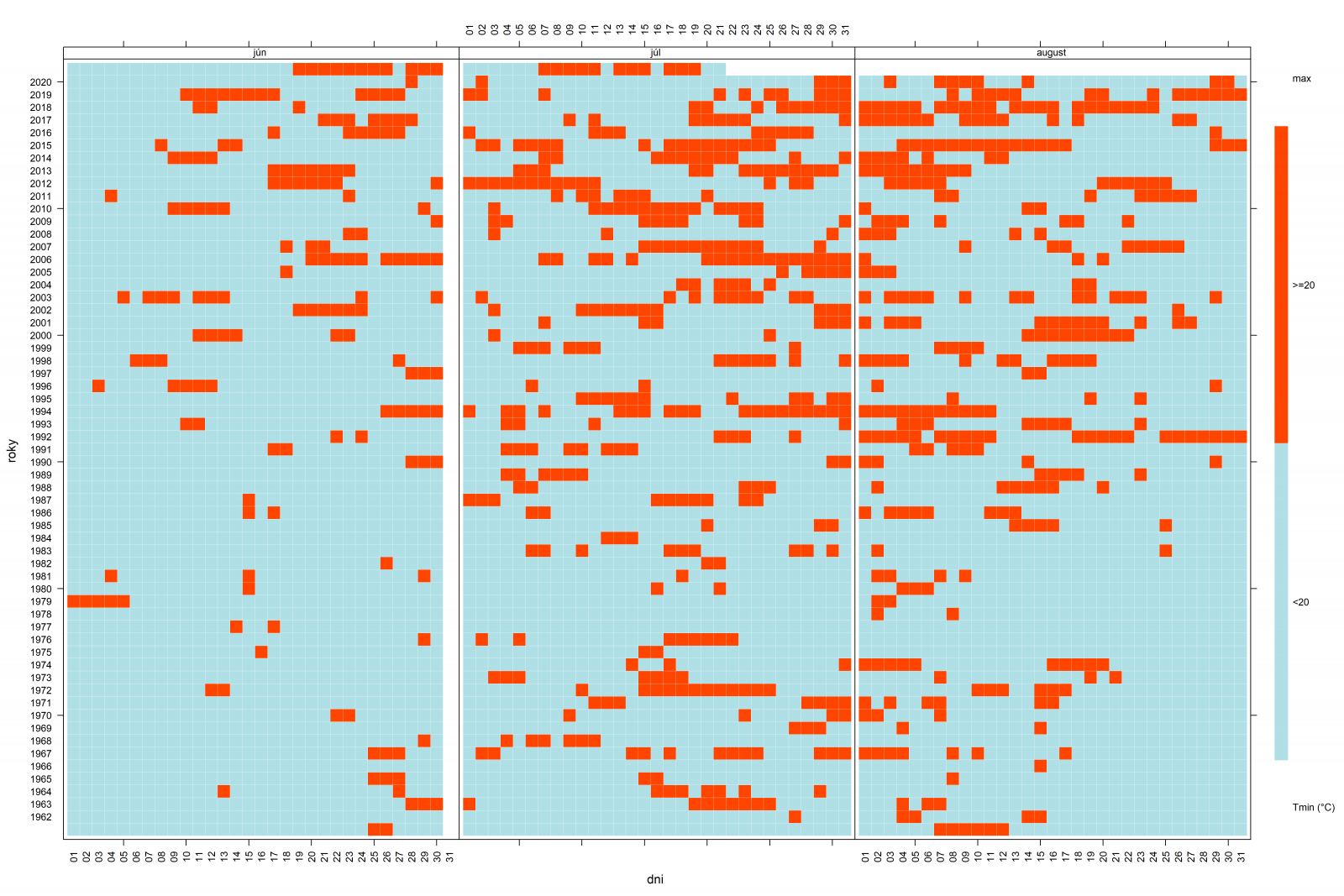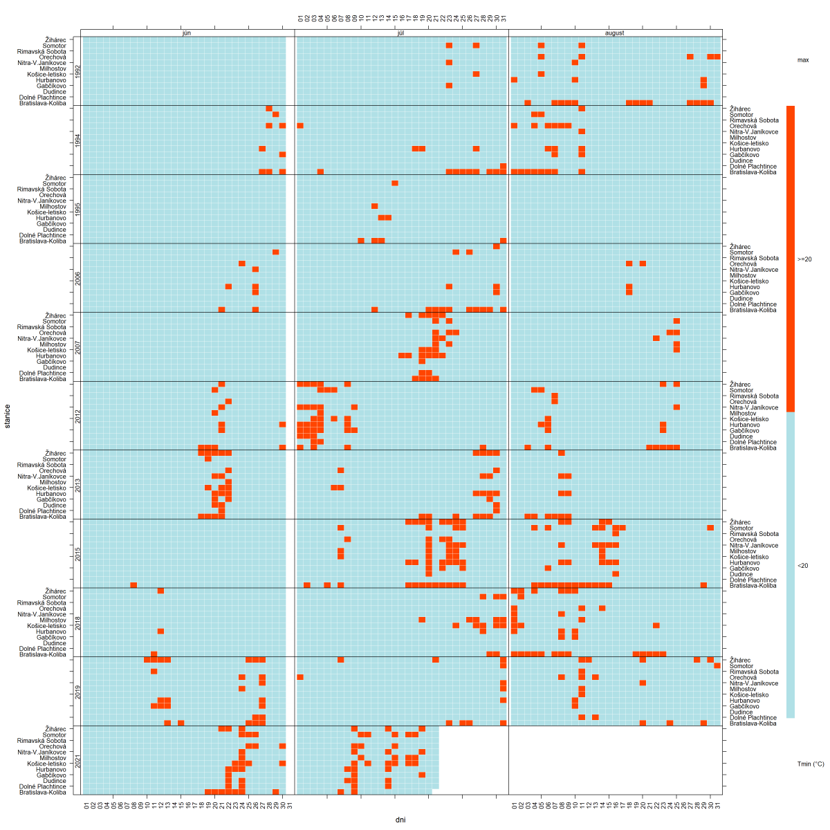Striktne v rámci júna sme najdlhšiu sériu dní s Tmin ≥ 20 °C zaznamenali v tomto roku v trvaní 6 dní na bratislavskej Kolibe 19. – 24. júna 2021 (z meteorologickej stanice Bratislava-Mlynská dolina bola dokonca predbežne hlásená až 7-dňová séria 18. – 24. júna 2021, príslušné údaje však zatiaľ v našej databáze oficiálne chýbajú). Pre júl držia analogický celoštátny extrém s dĺžkou 9 takýchto dní stanice Bratislava-Petržalka (23. – 31. júla 1994) a Bratislava-Koliba (17. – 25. júla 2015), a pre august s dĺžkou 12 dní opäť Bratislava-Koliba (4. – 15. augusta 2015).