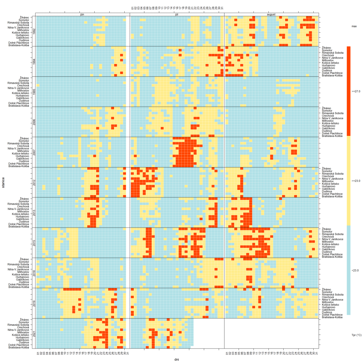 Najdlhšie trvajúca súvislá perióda dní s Tpr ≥ 27,0 °C na Slovensku z pohľadu územného výskytu bola 14-dňová, a to 26. júla – 8. augusta 1994. Najdlhší júnový priestorový výskyt takýchto dní u nás je zhodný s prezentovaným staničným (6 dní), najdlhší júlový dosiahol 10 dní 15. – 24. júla 2007 a najdlhší augustový 11 dní 6. – 16. augusta 2015.