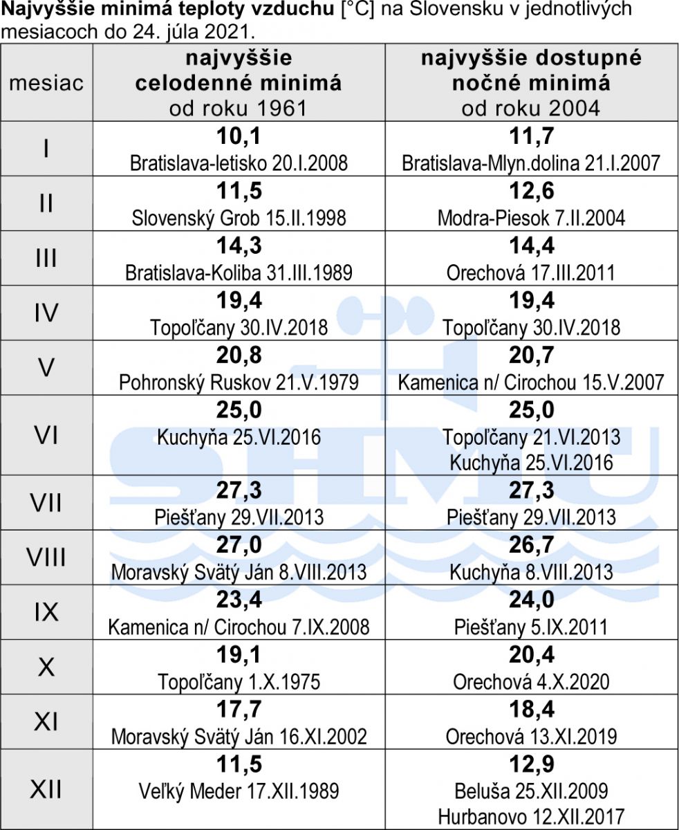▼ Tab. 1: Najvyššie minimá teploty vzduchu na Slovensku v jednotlivých mesiacoch do 24. júla 2021.