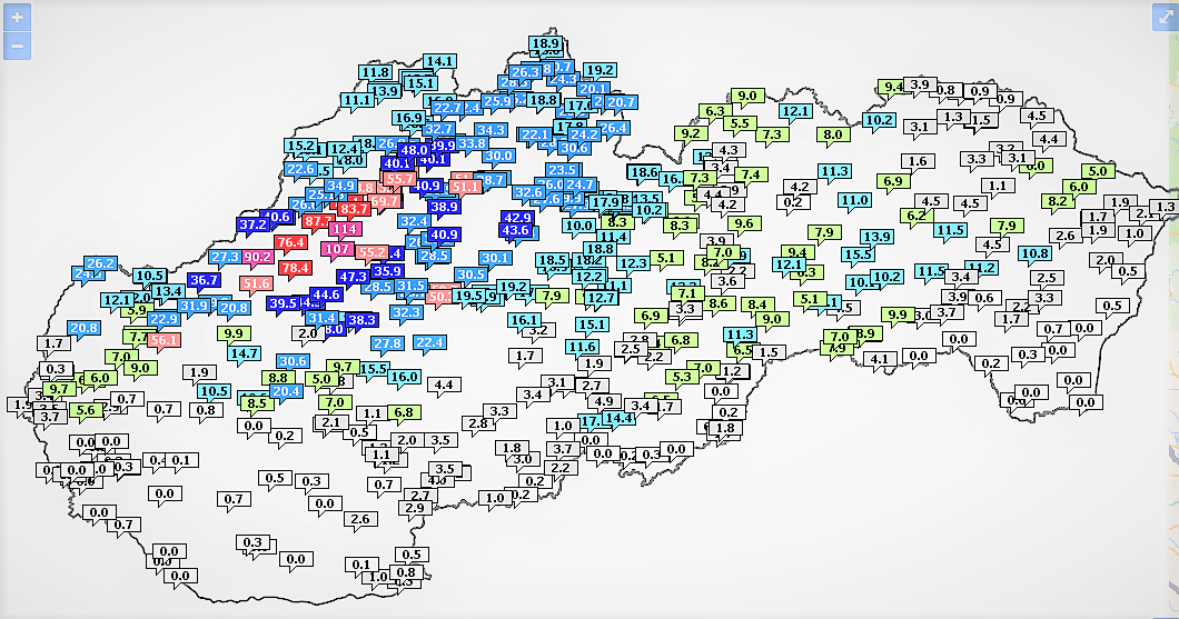 Výrazné zrážkové úhrny boli zaznamenané najmä v oblasti Záhoria, Malých Karpát, v povodí horného a stredného Váhu a v povodiach hornej Nitry. Namerané úhrny(k 6.00 hod.)boli zväčša od 5 mm do 30 mm, v povodí stredného Váhu a hornej Nitry a ojedinele aj v Malých Karpatoch 30 mm až 76 mm, jedinele aj viac. Maximálne úhrny boli namerané v Zliechove (112 mm) a vo Valaskej Belej (104 mm).