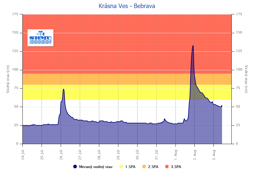 V popoludňajších a nočných hodinách z nedele 1.8. na pondelok 2.8. boli zaznamenané výrazné vzostupy vodných hladín na tokoch v povodiach stredného, horného Váhu a hornej Nitry aj s prekročením 1. až 3. stupňov PA. Hladiny tokov v horných úsekoch v priebehu noci kulminovali a v pondelok 2.8. k 6:00 hod. už boli po kulmináciách v poklese, na stredných a dolných úsekoch tokov bol ešte vzostup z dotekania.