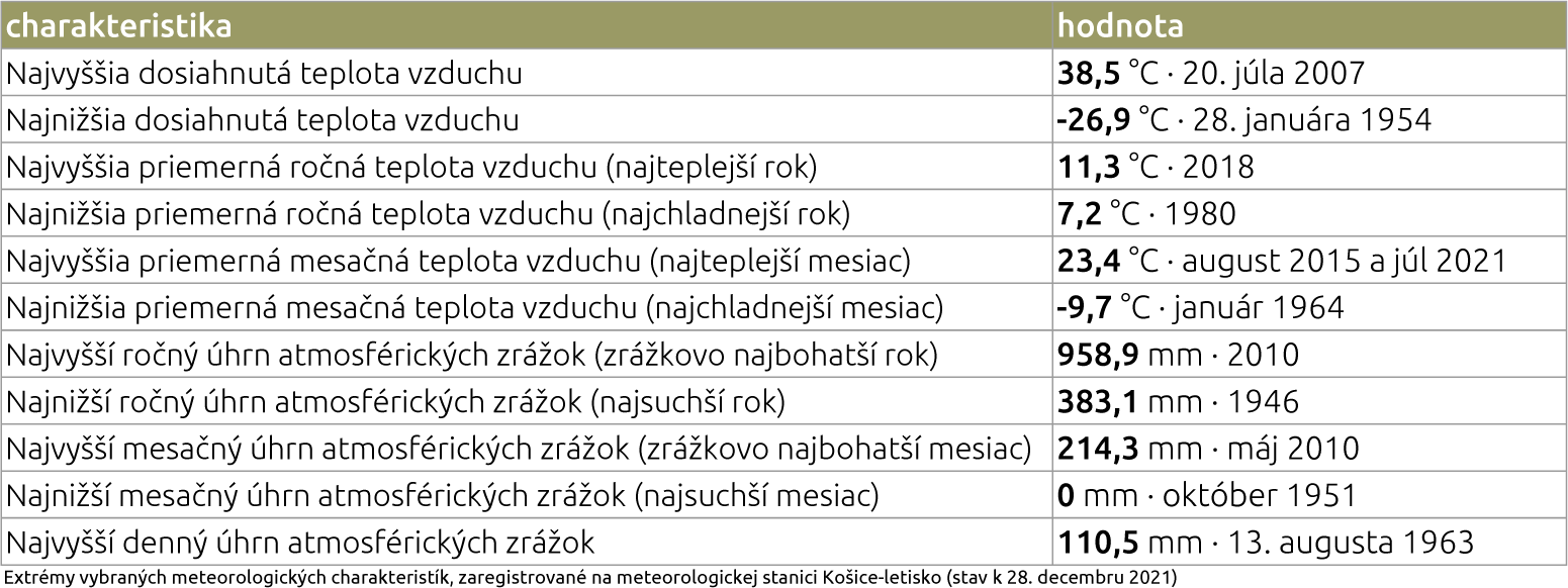 ▼ Tab. 1: Extrémy vybraných meteorologických charakteristík, zaregistrované na meteorologickej stanici Košice-letisko (stav k 28. decembru 2021).