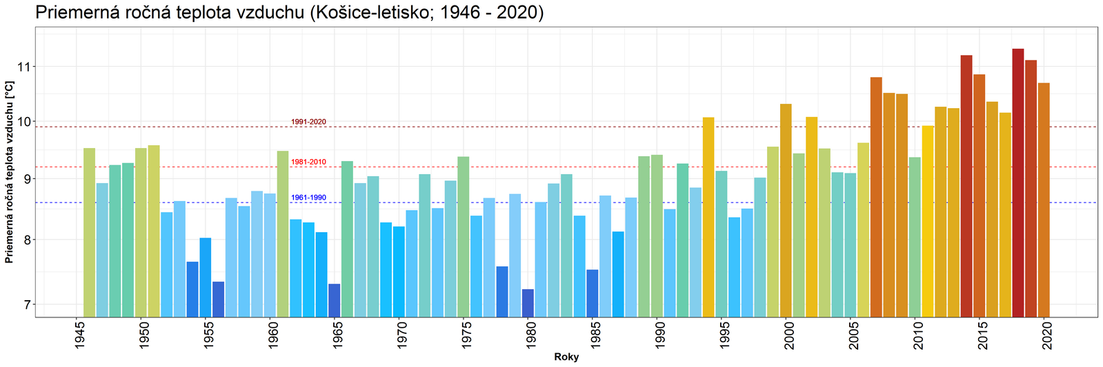 ▲ Obr. 1: Vývoj a štandardné normály priemernej ročnej teploty vzduchu na meteorologickej stanici Košice-letisko v období rokov 1946 – 2020.