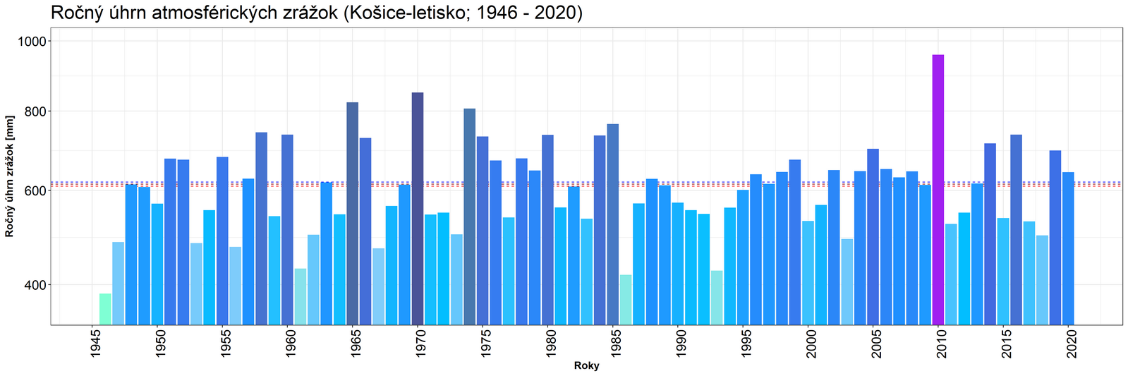 ▲ Obr. 2: Vývoj a štandardné normály ročných úhrnov atmosférických zrážok na meteorologickej stanici Košice-letisko v období rokov 1946 – 2020.