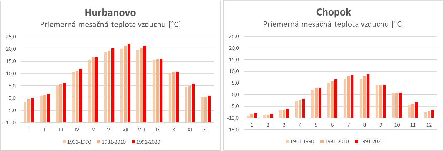 ▲ Obr. 2: Porovnanie priemernej mesačnej teploty vzduchu za normálové obdobia 1961 - 1990, 1981 - 2010 a 1991 - 2020 na meteorologických staniciach Hurbanovo a Chopok (Zdroj: SHMÚ).