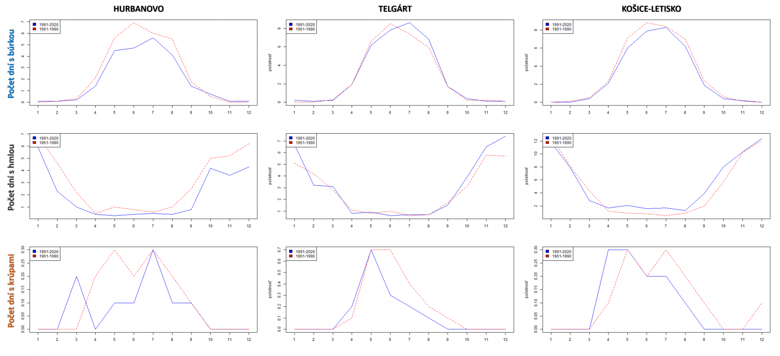 Do analýzy sme zahrnuli 15 staníc s profesionálnym režimom pozorovania. V prípade dní s búrkou je spoločným ukazovateľom, ktorý môžeme pozorovať na všetkých staniciach, posun ich maximálnej početnosti z mesiaca jún na júl. Na staniciach západného Slovenska sa počet dní s búrkami zmenil len nevýrazne alebo poklesol, príkladom poklesu môže byť napr. Hurbanovo (pokles z priemeru 28,8 dní s búrkou ročne v normálovom období 1961 – 1990 na 23 dní v normálovom období 1991 – 2020). V prípade staníc v Tatrách, Nízkych Tatrách a ich okolí došlo aj k miernemu nárastu početnosti búrok za rok – napr. pre stanicu Telgárt zaznamenávame ročný priemer 34,1 dní s búrkou v porovnaní s predošlým normálovým obdobím s 32,8 dňami ročne. Vo východnej polovici Slovenska je tiež nevýrazná zmena počtu búrkových dní, prípadne sledujeme len nevýrazný rasť početnosti.