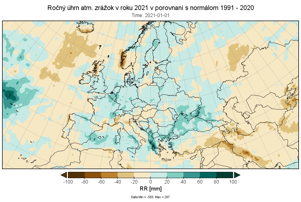 ▲ Obr. 3: (vľavo) Odchýlka priemernej ročnej teploty vzduchu v Európe v roku 2021 v porovnaní s normálom 1991 - 2020 (v °C); (vpravo) ročný úhrn atmosférických zrážok v Európe v roku 2021 v porovnaní s normálom 1991 - 2020 na základe údajov globálnej reanalýzy ERA5 (spracoval SHMÚ na základe údajov ECMWF).