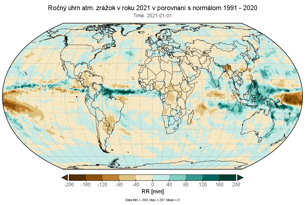 ▲ Obr. 2: (vľavo) Odchýlka priemernej ročnej teploty vzduchu v roku 2021 v porovnaní s normálom 1991 - 2020 (v °C); (vpravo) ročný úhrn atmosférických zrážok v roku 2021 v porovnaní s normálom 1991 - 2020 na základe údajov globálnej reanalýzy ERA5 (spracoval SHMÚ na základe údajov ECMWF).