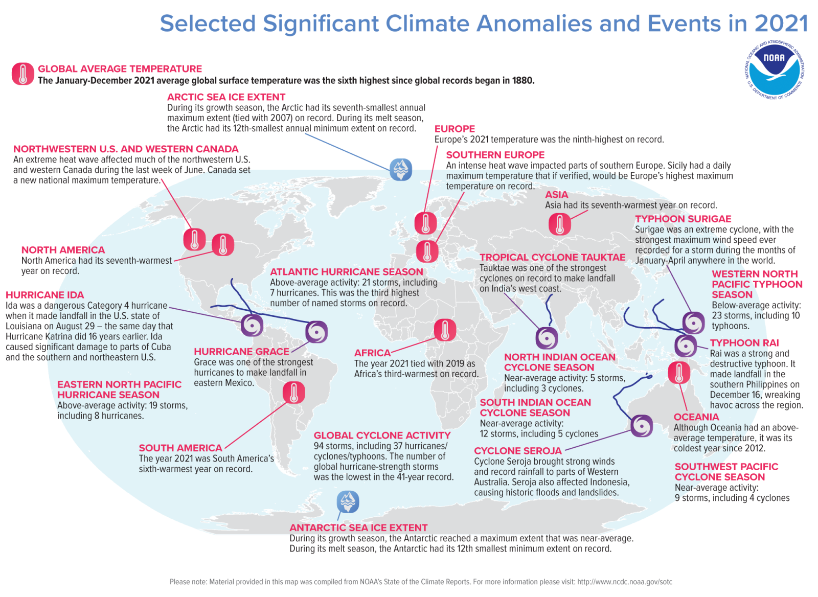 Rok 2021 bol pozoruhodný aj z hľadiska výskytu mimoriadnych prípadoch extrémneho počasia. Ich priestorový a časový výskyt dokumentuje v období do konca septembra 2021 interaktívna mapa zverejnená a predbežnom hodnotení stavu klímy za rok 2021. Prehľad najvýznamnejších extrémov počasia za rok 2021 prináša aj grafické spracovanie NOAA.