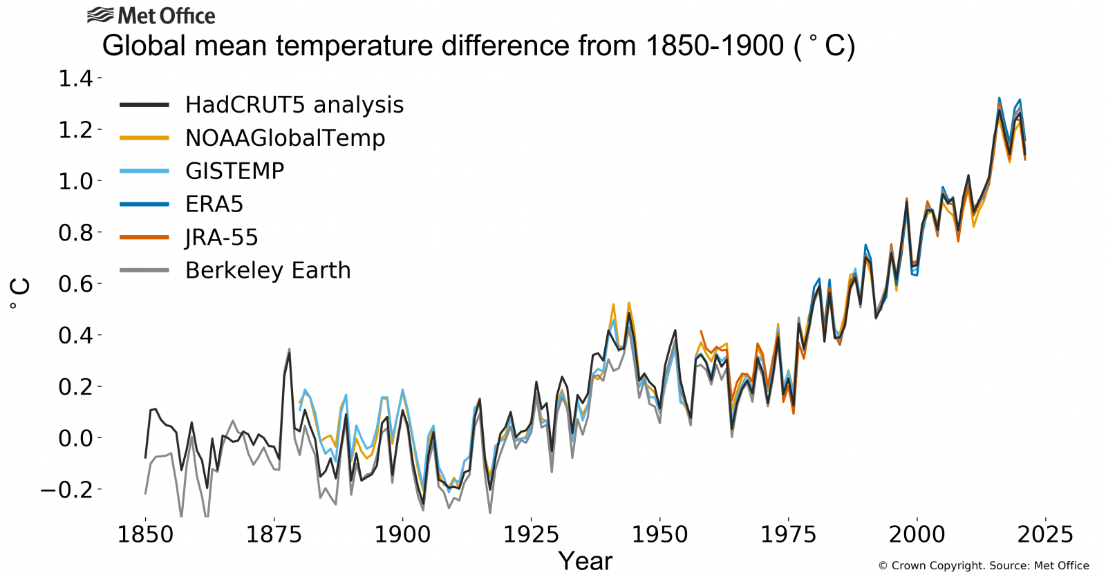 Priemerná globálna teplota povrchu pevnín a oceánov bola v roku 2021 približne o 1,11 (± 0,13) °C vyššia v porovnaní s dlhodobým priemerom predindustriálneho obdobia (1850 – 1900). Rok 2021 je siedmy po sebe idúci rok (2015 – 2021), v ktorom bola priemerná globálna teplota podľa všetkých údajových súborov zostavených WMO o viac ako 1 °C nad úrovňou priemeru za obdobie 1850 – 1900. WMO na zabezpečenie najkomplexnejšieho a najspoľahlivejšieho hodnotenia teploty pri analýze využíva šesť medzinárodných údajových súborov. Rovnaké údaje používa vo svojich výročných správach o stave klímy, ktoré informujú medzinárodné spoločenstvo o globálnych klimatických ukazovateľoch.
