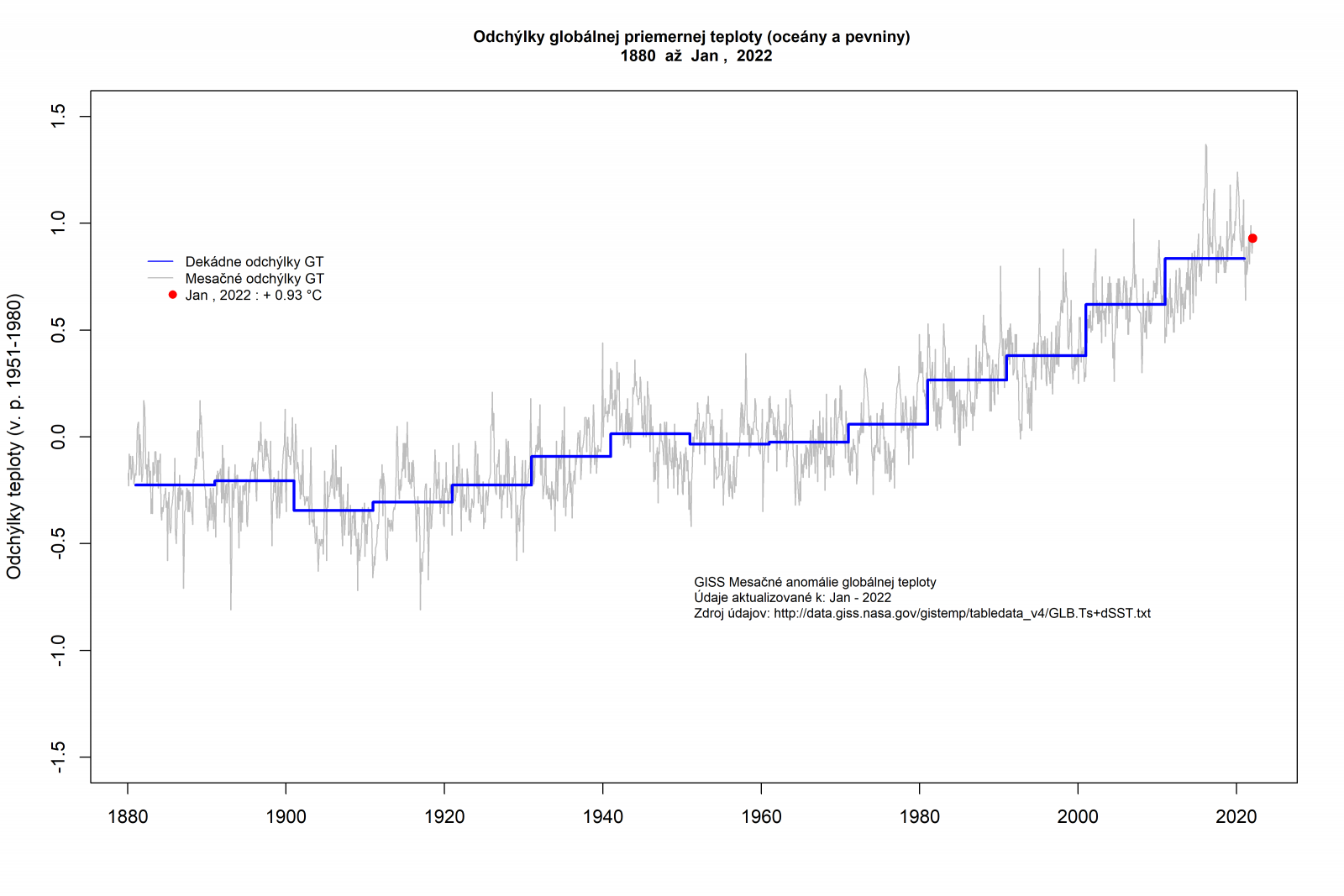 ▲ Obr. 1: (vľavo) Vývoj odchýlky globálnej teploty povrchu pevnín a oceánov (v p. s obdobím 1850 - 1990) podľa údajov klimatologických centier GISS NASA, NOAA, ECMWF, Met Office, JRA a Berkeley v období rokov 1850 - 2021 (Zdroj: WMO); (vpravo) mesačné odchýlky globálnej teploty povrchu pevnín a oceánov (v p. s priemerom 1951 - 1980) podľa GISS NASA v období rokov 1880 - 2022 (spracoval SHMÚ na základe údajov NASA).