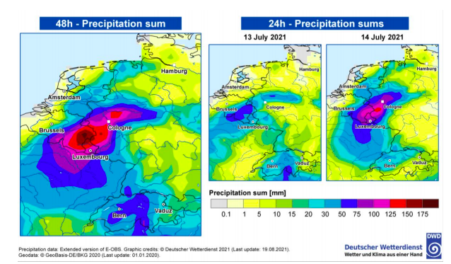 Problémy s ničivými povodňami sa nevyhli v priebehu minuloročného leta ani západnej Európe. V priebehu dvoch dní (14. až 15. júla 2021) spadlo v rozsiahlej oblasti západného Nemecka a východného Belgicka 100 až 150 mm. Najvyšší denný úhrn zrážok namerali vo Wipperfürth-Gardenau (162,4 mm; Nemecko). Zrážky pritom padali do už vodou nasýtených povodí, čo viedlo k mimoriadne ničivým a rýchlym záplavám, povodniam a zosuvom pôdy. Povodne si vyžiadali viac ako 200 ľudských životov.