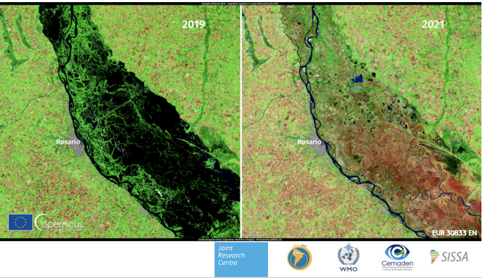 ▲ Obr. 7: Suchom zasiahnutá riečna sústava ramien dolného toku Paraná (v regióne La Plata; Argentína) v roku 2021 - vpravo (Zdroj: WMO, JRC).