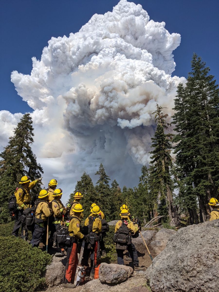 ▲ Obr. 5: (vľavo) Zásahový tím požiarnikov z oblasti Santa Clara sledujuci požiar Dixie Fire v ranných hodinách dňa 24. júla 2021; (vpravo) satelitný záber na región strednej a severnej Kalifornie s výraznou dymovou vlečkou požiaru Dixie Fire dňa 21. júla 2021 (Zdroj: Capt. Eric Limones, Cal Fire Santa Clara Unit, NASA).