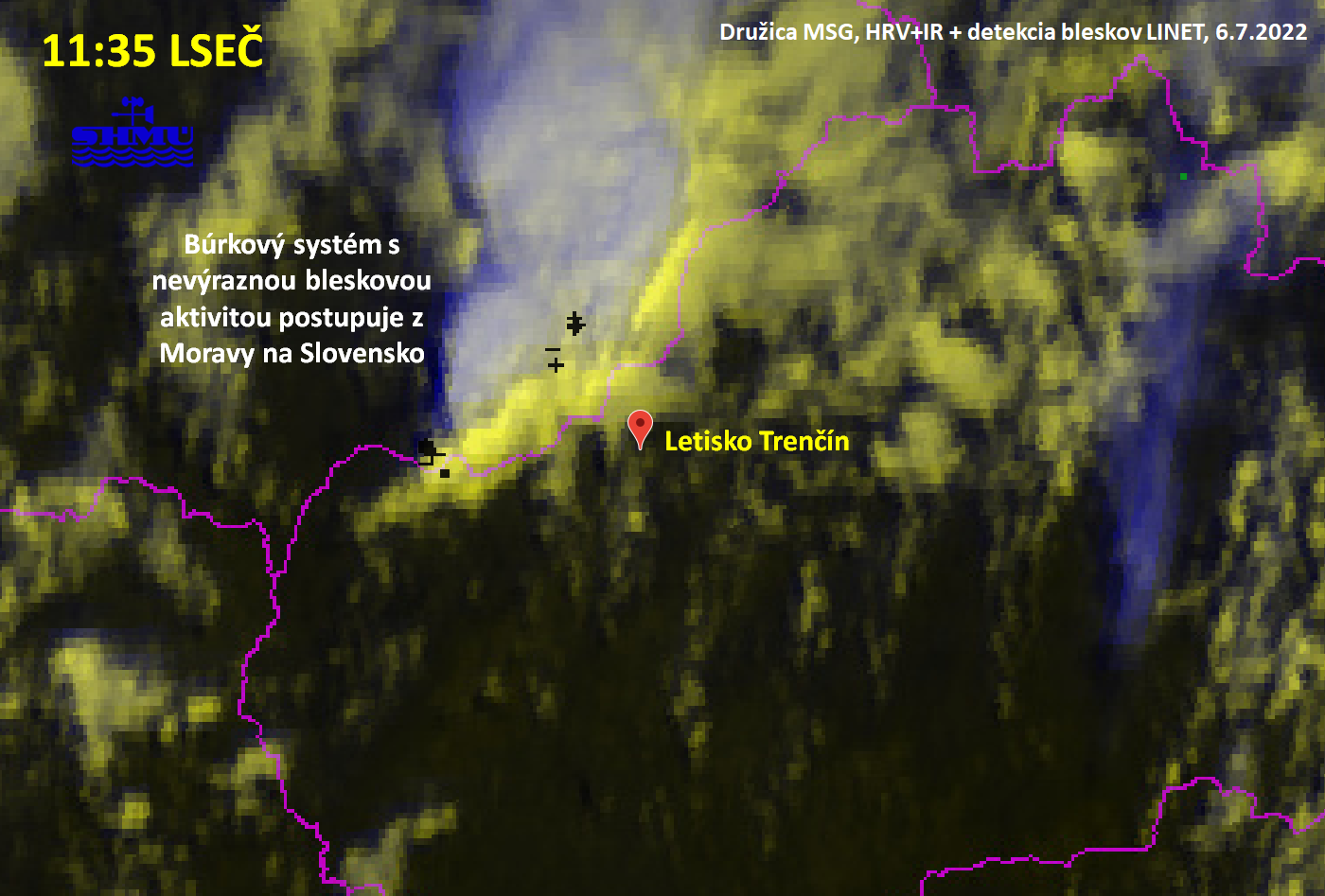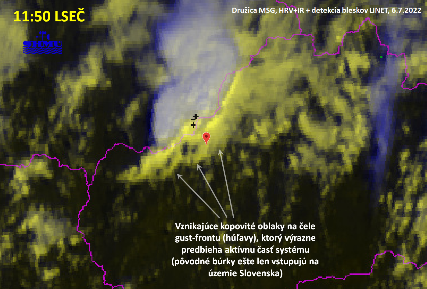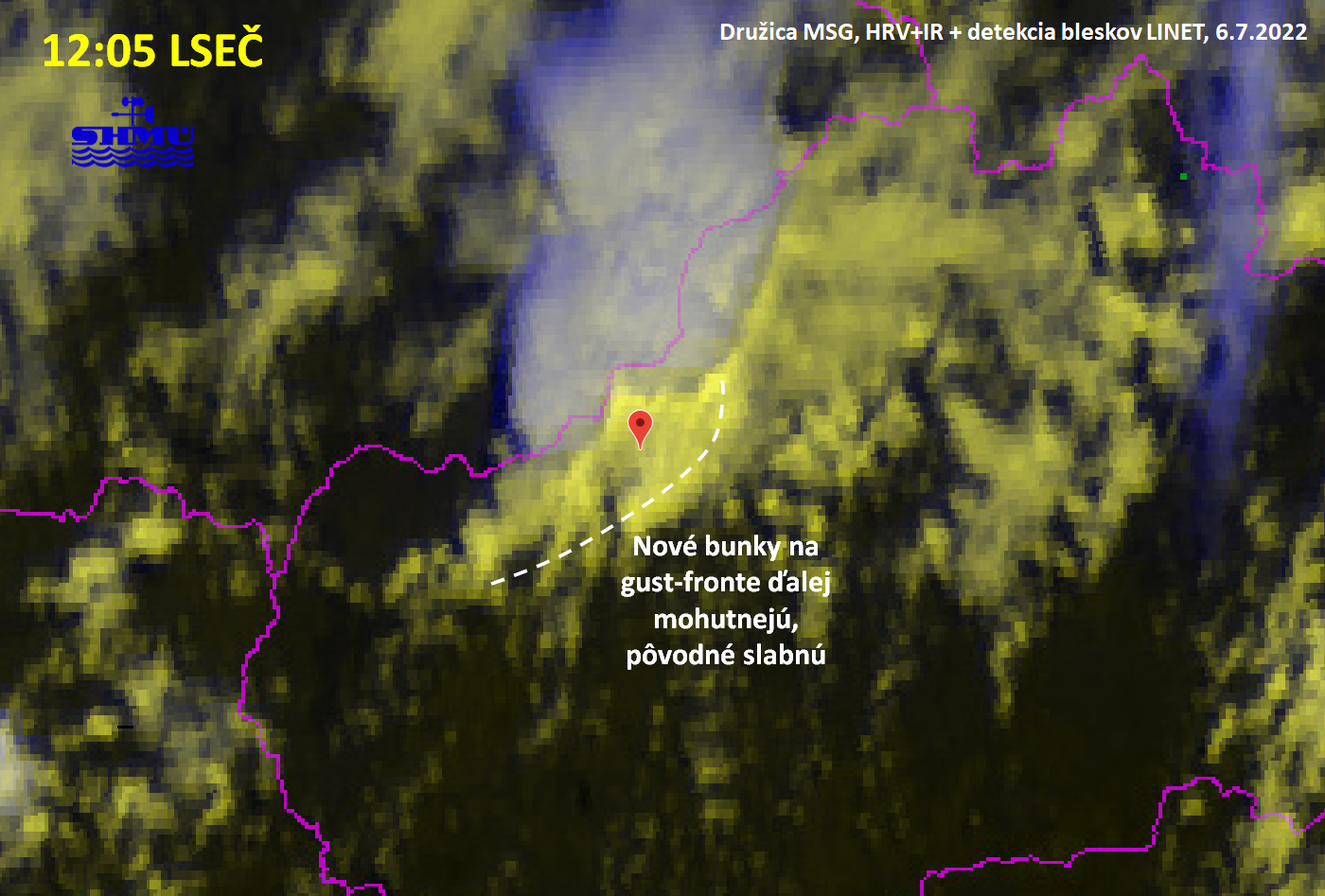 ▲ Obr. 4: Vývoj búrkového systému na snímkach z družice MSG a detekcia bleskov LINET SK, 6.7.2022, čas a popis uvedený v obrázkoch (porovnaj s obr. 5-9).