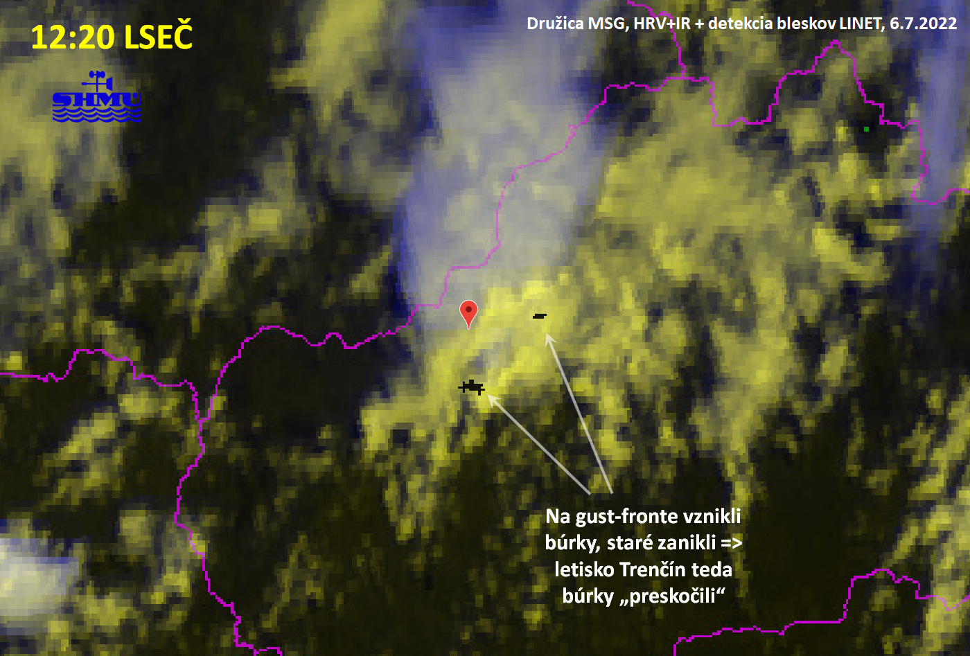 Popísaný vývoj sme zaznamenali aj prostredníctvom dištančných meraní a pozorovaní. Z družicových snímok a systému detekcie bleskov Linet (obr. 4) vidieť, ako trenčianskej letisko búrky "preskočili", pretože gust-front (húľava) postúpil príliš rýchlo cez oblasť ďalej na juhovýchod (príčiny jeho zrýchlenia popísané v predošlom odseku). Zároveň nad letiskom a tesne za ním došlo na gust-fronte k vývoju nových buniek (obr. 4, 12:05 LSEČ), z ktorých sa postupne vyvinuli búrky (obr. 4, 12:20 LSEČ). Vývoj týchto buniek mohol byť opätovne podporený vynúteným výstupom vzduchu na náveternej strane Trenčianskej vrchoviny a Považského Inovca (prípadne šírením vĺn zo systému búrok; animácia 1). Vývoj oblačnosti búrkového systému sme pozorovali aj priamo na letisku - popis v súvislosti s popísaným vývojom uvádzame v obrázkoch 5-8.