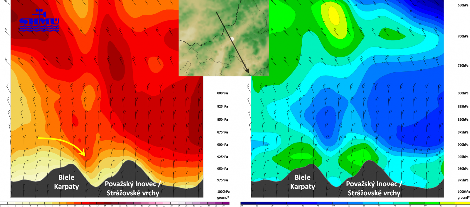 ▲ Obr. 3: Vertikálne rezy meteorologických veličín na podklade orografie (sivé plochy), rez vyznačený v strede hore, označené letisko Trenčín, hrebene pohorí orientované prevažne v smere juhozápad - severovýchod, tj. prúdenie má aj priečnu zložku vzhľadom na pohorie. Vľavo: vietor (m/s, farebná škála a symboly), označené zostupné prúdenie za Bielymi Karpatami; vpravo: relatívna vlhkosť (%, farebná škála) a vietor (symboly). Výstupy z numerického nehydrostatického modelu ALARO s horizontálnym rozlíšením 2 km; beh 6.7.2022, 00:00 UTC, predpoveď pre 08:00 UTC (10:00 LSEČ).