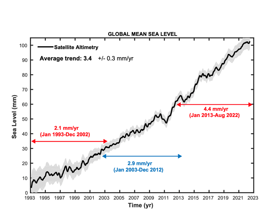 Priemerná výška hladiny svetového oceánu stúpala v období 30 rokov (satelitné pozorovanie v rokoch 1993 – 2022) odhadom v priemere o 3,4 ± 0,3 mm/rok. Rýchlosť nárastu sa zdvojnásobila medzi rokmi 1993 – 2002 a 2013 – 2022. Hladina oceánu sa medzi januárom 2021 a augustom 2022 zvýšila asi o 5 mm (obrázok 3). Zrýchlenie nárastu priemernej výšky hladiny svetového oceánu je spôsobené rastúcim tempom topenia sa ľadovcov.