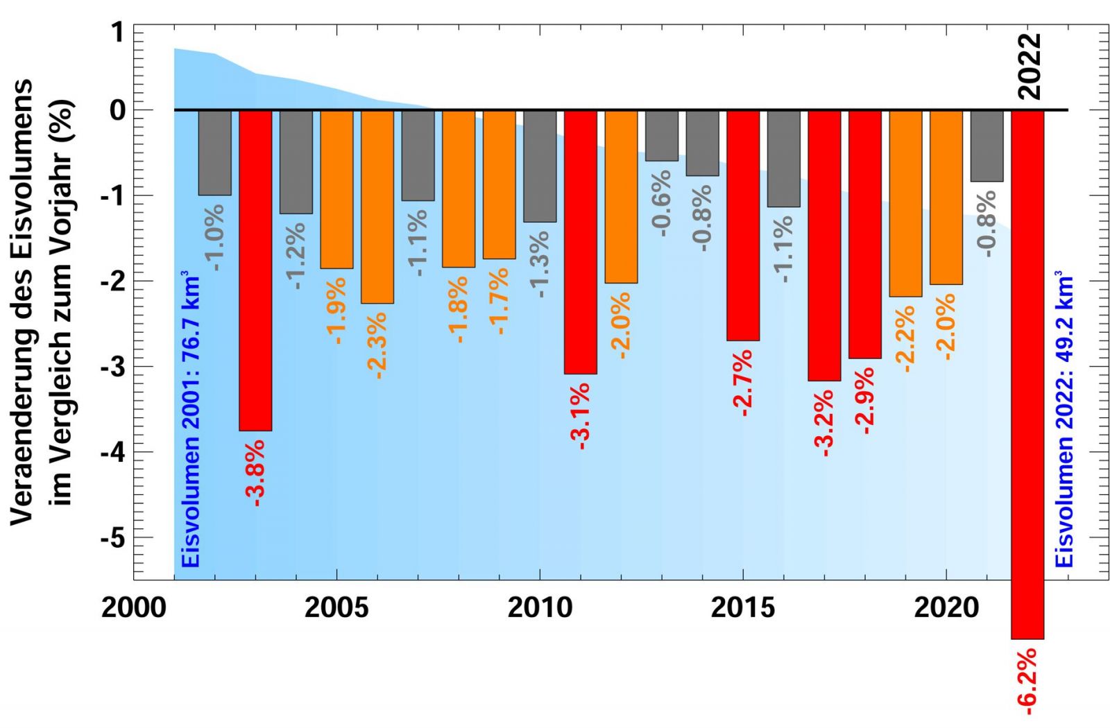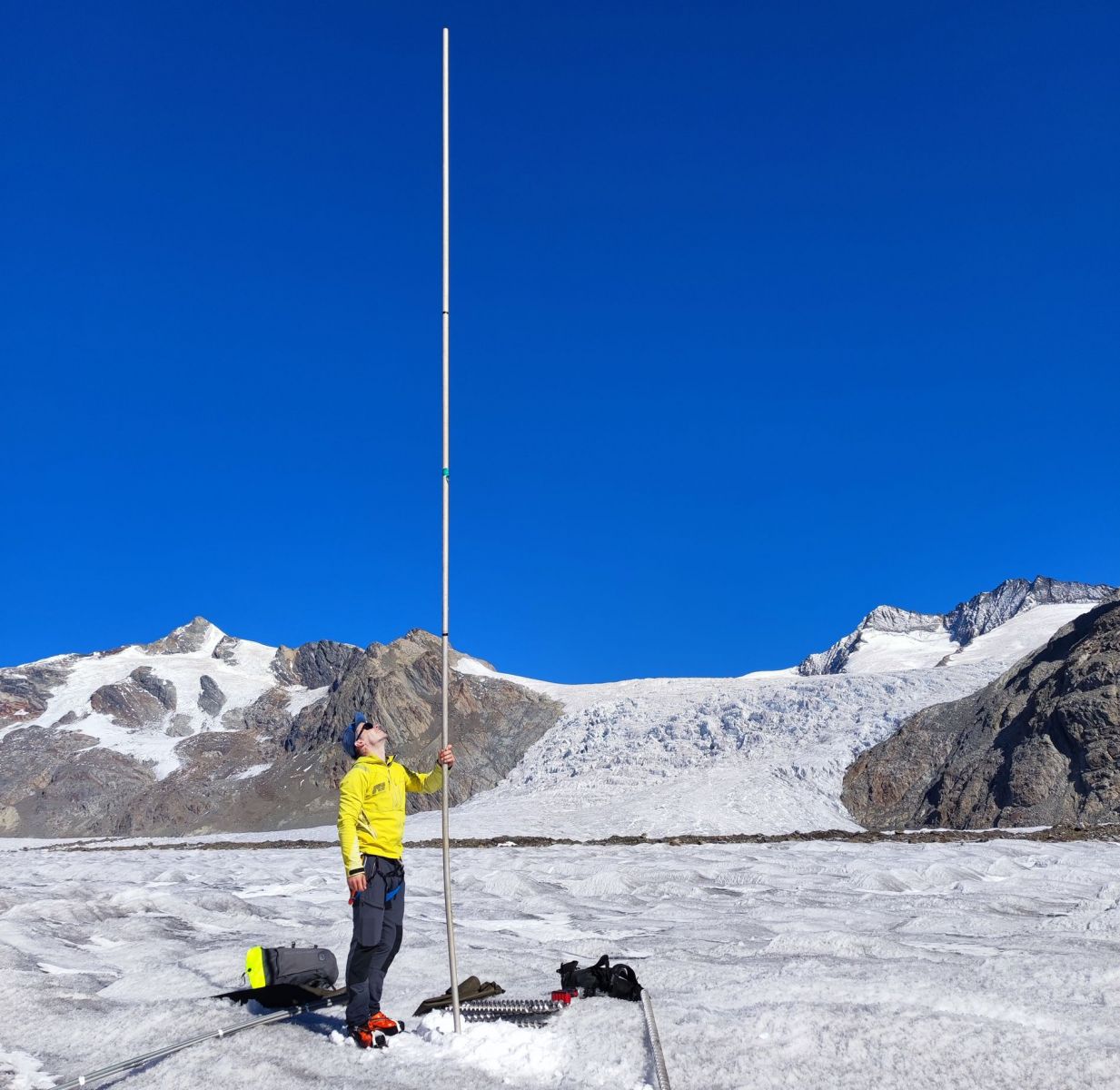 ▲ Obr. 3: Švajčiarsky glaciológ (vľavo) na fotografii názorne ukazuje teleskopickou tyčou, koľko metrov zo svojej hrúbky stratil tento rok (2022) najväčší alpský ľadovec, Aletsch, v oblasti známej ako Konkordia - viac ako 6 metrov; (vpravo) od roku 2001 stratili len švajčiarske ľadovce viac ako 35 % svojho objemu (takmer 28 kubických kilometrov), a len tento rok to bolo až ako 3 kubické kilometre (6 %), ľadovce v švajčiarskych Alpách strácajú ročne v priemere 1,25 kubického kilometra ľadu [Zdroj: SCNAT].