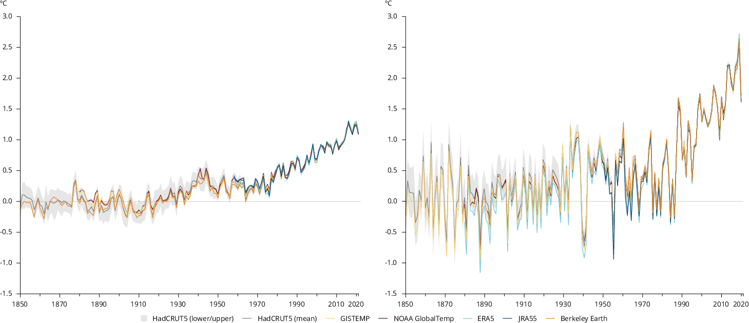 ▲ Obr. 1: Vývoj priemernej globálnej teploty (vľavo) a priemernej teploty v Európe (vpravo) v období rokov 1850 - 2021 [Zdroj: WMO, Copernicus].