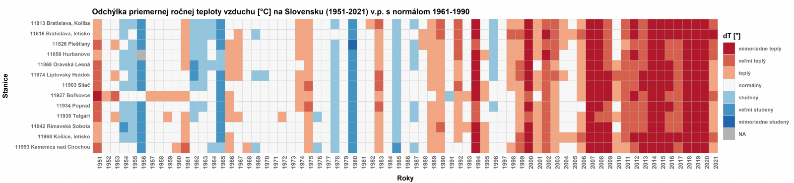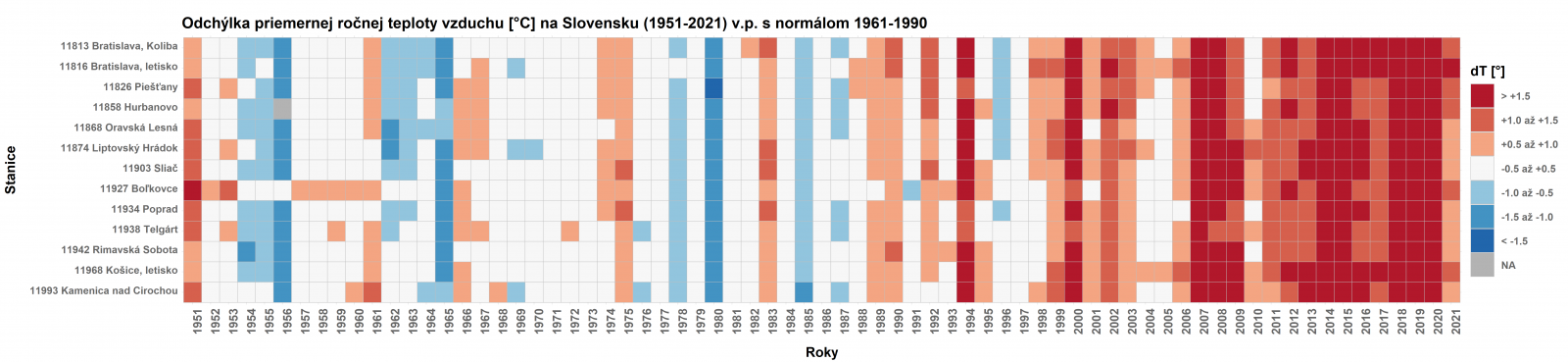 ▲ Obr. 4: Dlhodobé zmeny priemernej ročnej teploty vzduchu (vyjadrené v odchýlkach od normálu 1961-1990) na vybraných meteorologických staniciach na Slovensku (13 staníc) v období rokov 1951-2021 podľa údajov SHMÚ [Zdroj: KMIS SHMÚ].