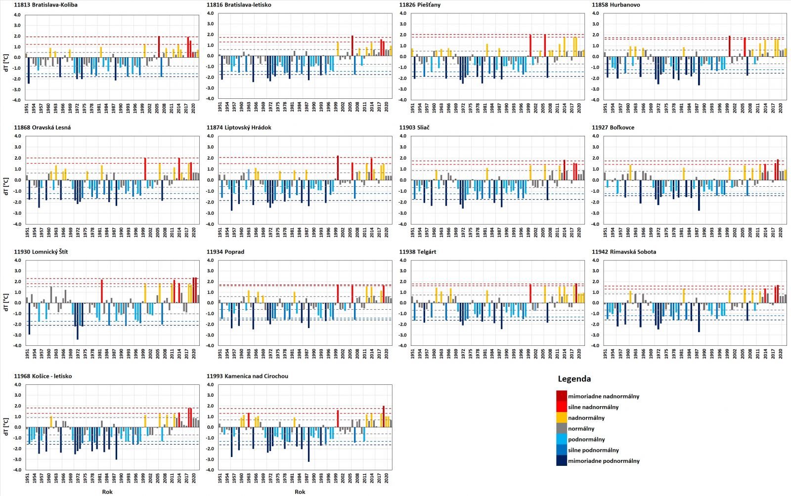 Obr. 2: Odchýlka priemernej teploty vzduchu [°C] od normálu 1961 - 1990 na vybraných meteorologických staniciach v období rokov 1951 - 2022 (zdroj: SHMÚ).