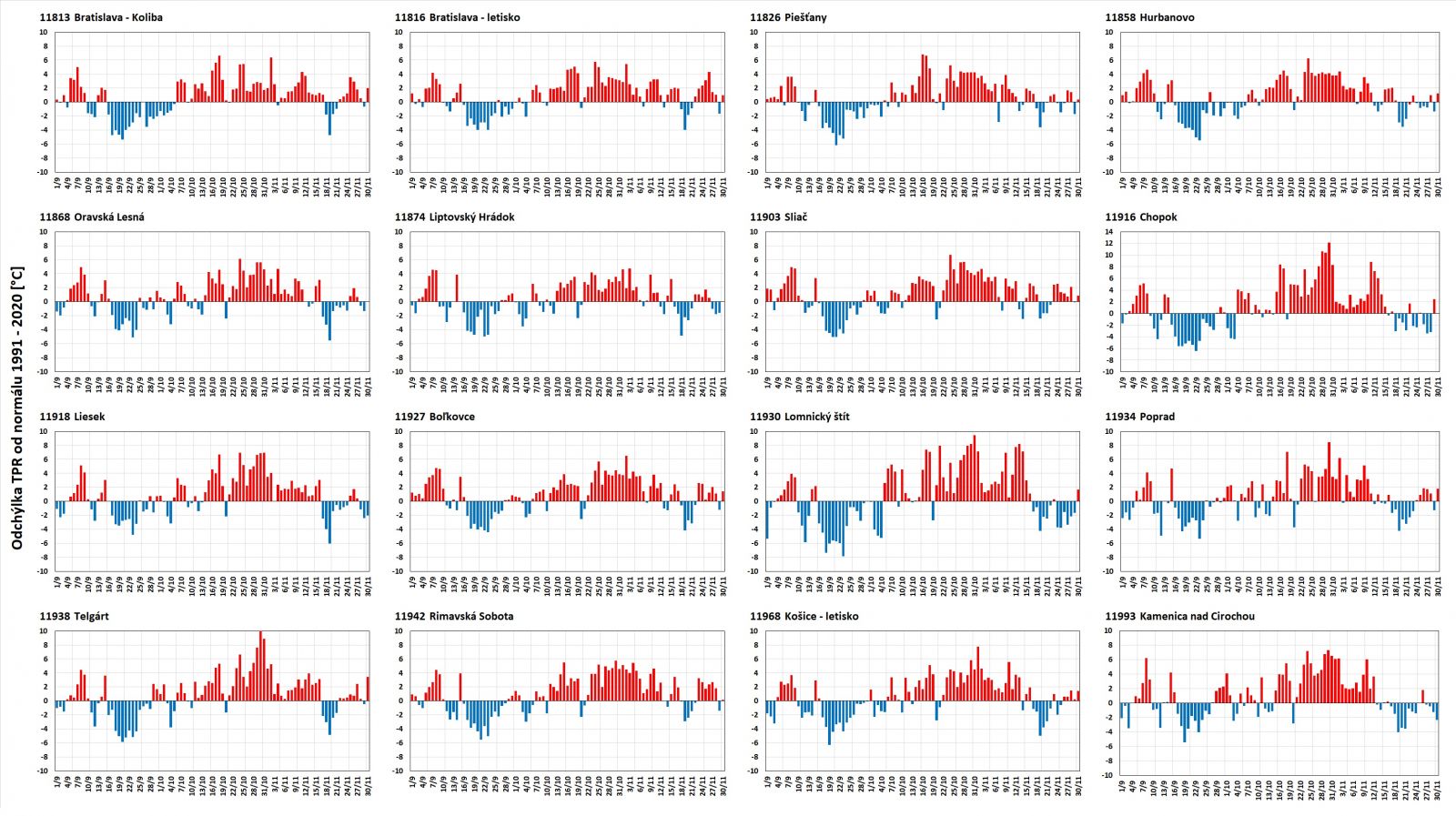 Obr. 1: Vývoj odchýlky priemernej dennej teploty vzduchu [°C] od normálu 1991 - 2020 na vybraných meteorologických staniciach na Slovensku v období v období 1.9. - 30.11.2022 (zdroj: SHMÚ).