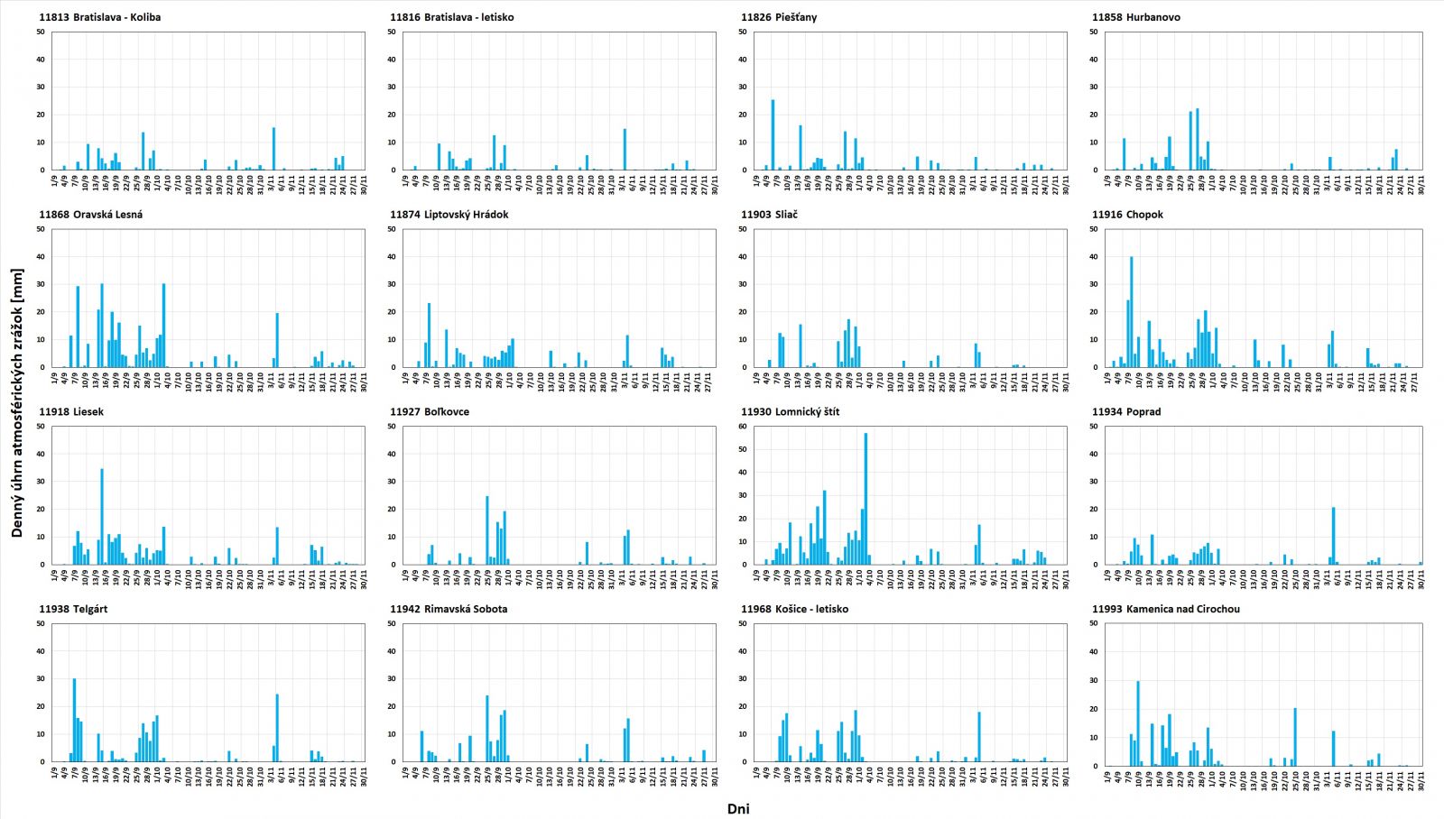 Obr. 3: Denný úhrn atmosférických zrážok [mm] na vybraných meteorologických staniciach na Slovensku v období v období 1.9. - 30.11.2022 (zdroj: SHMÚ).