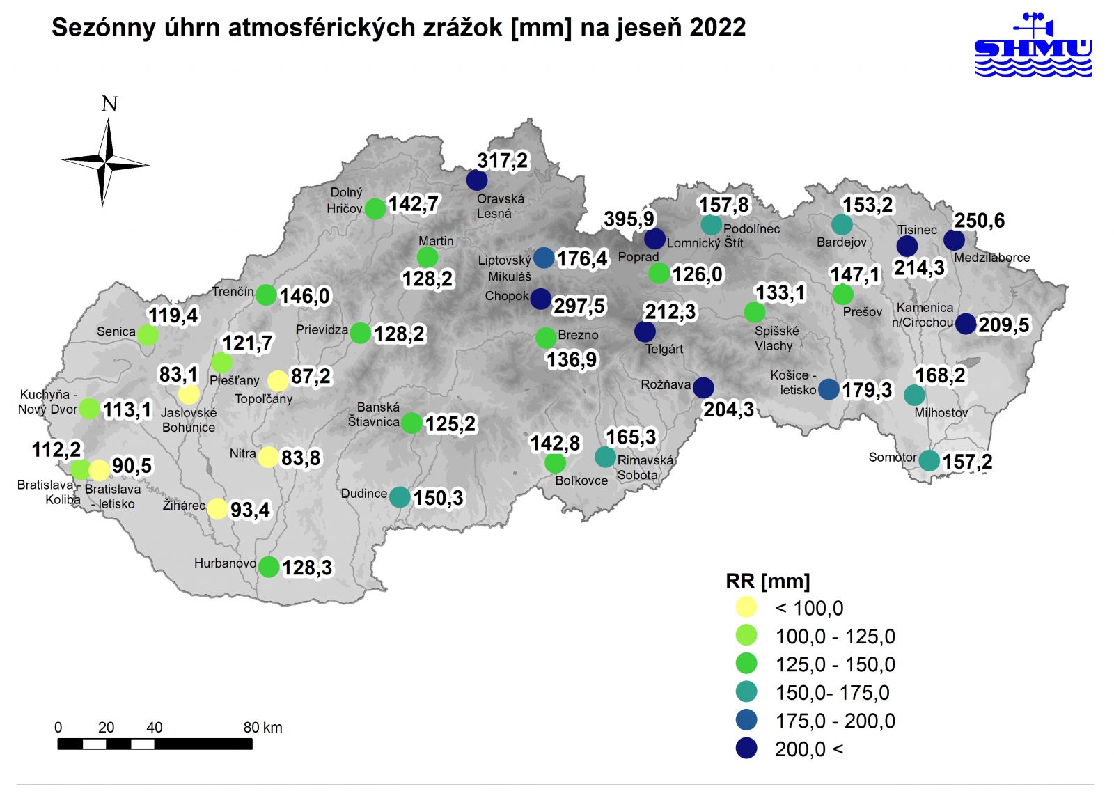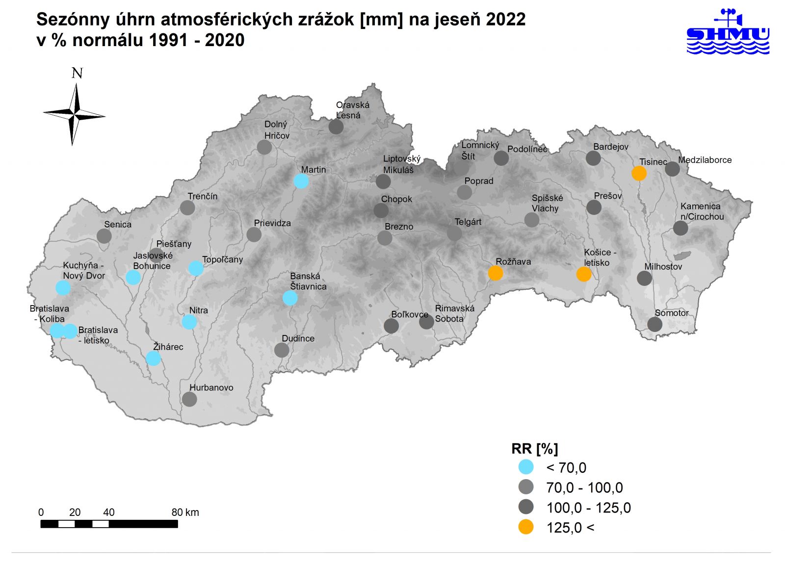 Na začiatku septembra 2022 bolo extrémne sucho podľa indexov SPEI a SPI na juhovýchode a krajnom východe Slovenska. Počas septembra bolo postupne dostatok zrážok a začali prevažovať normálne až mierne vlhké podmienky. Veľmi vlhko bolo v druhej polovici septembra v Oravskej Lesnej, Tisinci a podľa indexu SPI krátkodobo aj v Senici, Milhostove a Michalovciach. Na začiatku októbra boli na väčšine Slovenska normálne až veľmi vlhké podmienky. Extrémne vlhko bolo len lokálne na východe a Orave. V priebehu októbra sa situácia postupne zhoršovala a na konci októbra už prevažovali normálne až mierne suché vlahové podmienky. Veľmi sucho bolo podľa obidvoch indexov len v Hurbanove. Na začiatku novembra boli na väčšine Slovenska normálne vlahové podmienky. Mierne sucho bolo lokálne na Podunajskej nížine, v Žiline, na Orave a v Somotore. Veľmi sucho bolo len v Čadci. V druhej polovici novembra sa situácia ešte viacej zhoršila a na konci novembra bolo veľmi sucho už na 8 staniciach a extrémne sucho bolo v Banskej Štiavnici. Deficit zrážok za obdobie posledných 90 dní bol v tretej dekáde novembra najvyšší -68 mm v Banskej Štiavnici, -65 mm v Topoľčanoch a -59 mm v Banskej Bystrici.