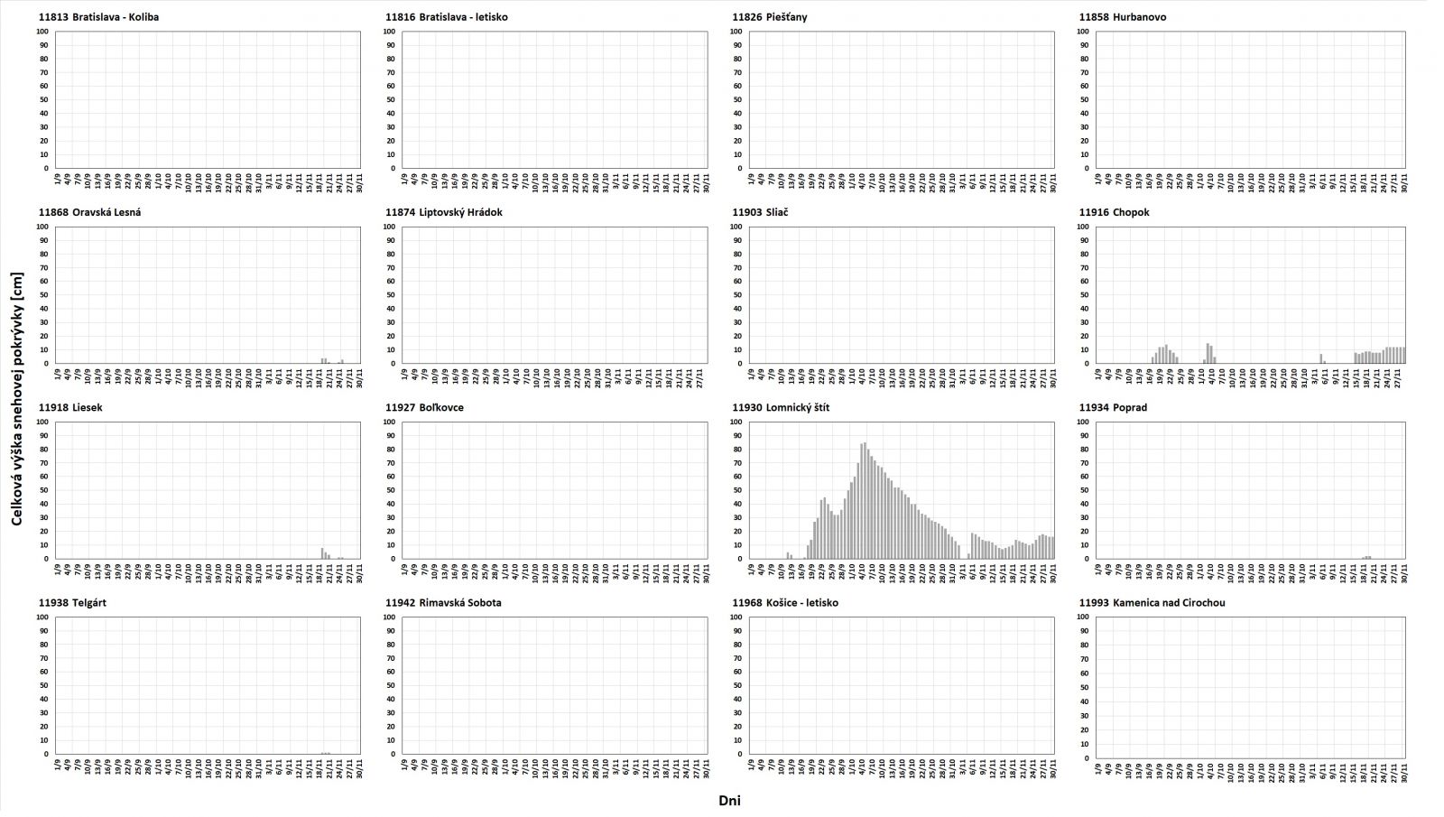 Obr. 4: Denný vývoj celkovej výšky snehovej pokrývky [cm] na vybraných meteorologických staniciach na Slovensku v období v období 1.9. - 30.11.2022 (zdroj: SHMÚ).