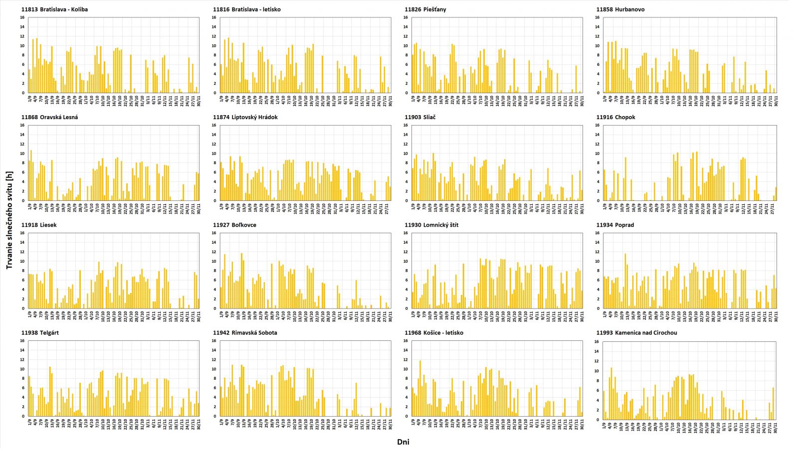 Obr. 7: Denný vývoj slnečného svitu [h] na vybraných meteorologických staniciach na Slovensku v období v období 1.9. - 30.11.2022 (zdroj: SHMÚ).