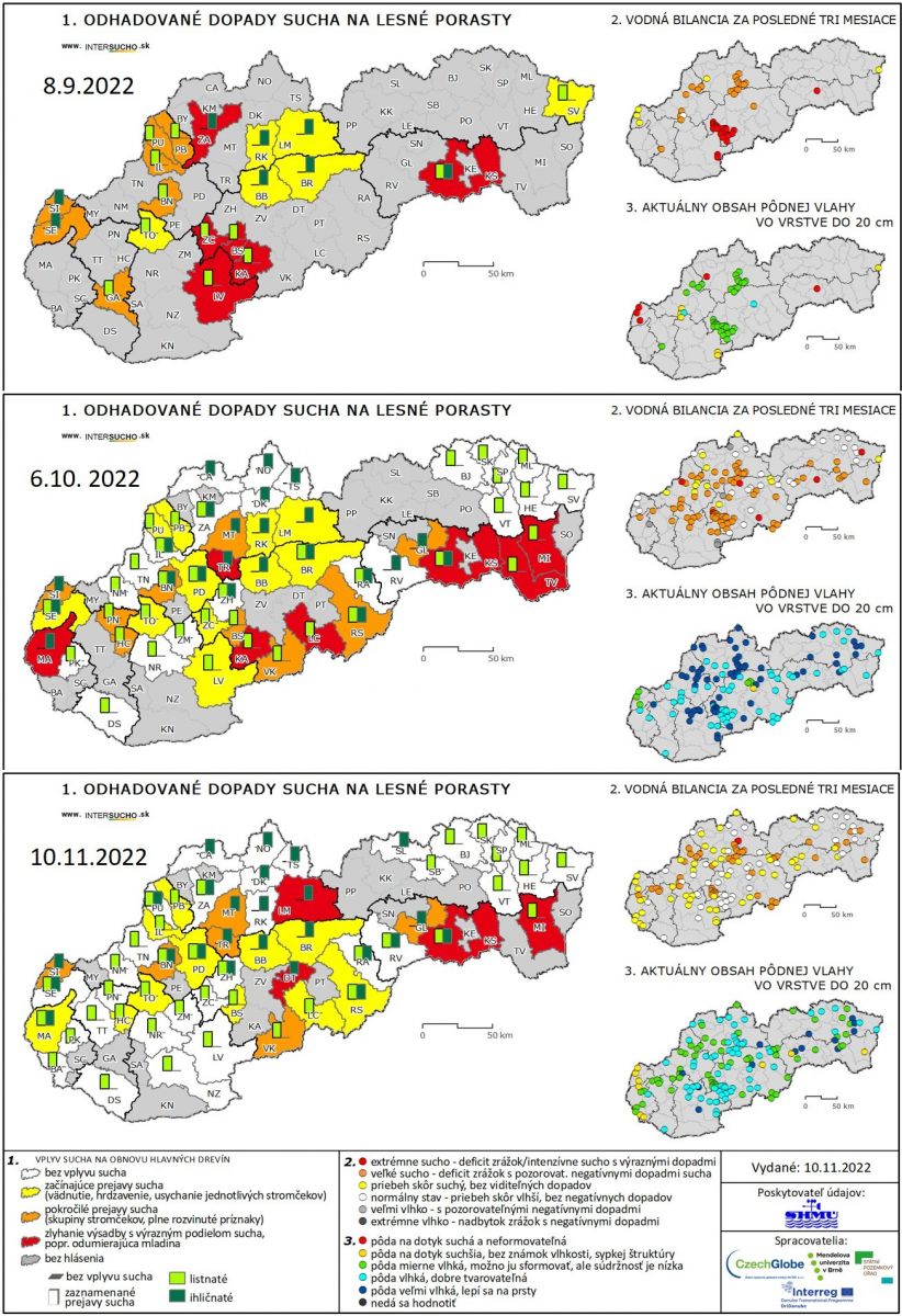Negatívne dopady sucha na lesné a poľnohospodárske spoločenstvá sme zaznamenávali aj počas mesiacov september, október, november v rámci monitoringu sucha na Slovensku – „Intersucho“ (https://www.intersucho.cz/sk/?mapcountry=sk&from=2022-11-14&to=2022-12-12¤t=2022-12-11). Napriek vyskytujúcim sa zrážkam počas jesene 2022 sme zaznamenali vo viacerých okresoch zlyhanie výsadieb lesných drevín spôsobených práve suchom. Najhoršia situácia bola počas mesiaca október najmä na východnom Slovensku, kde sme neúspešnú výsadbu najmä buka lesného a topoľa, v okresoch Lučenec to bola drevina dub zimný, na západe sme zaznamenali v okrese Malacky neúspešnú výsadbu borovice lesnej. Zaujímavé je, že ešte aj v mesiaci november sme zaznamenávali v niektorých spomenutých okresoch pretrvávajúce negatívne dopady na lesné výsadby.