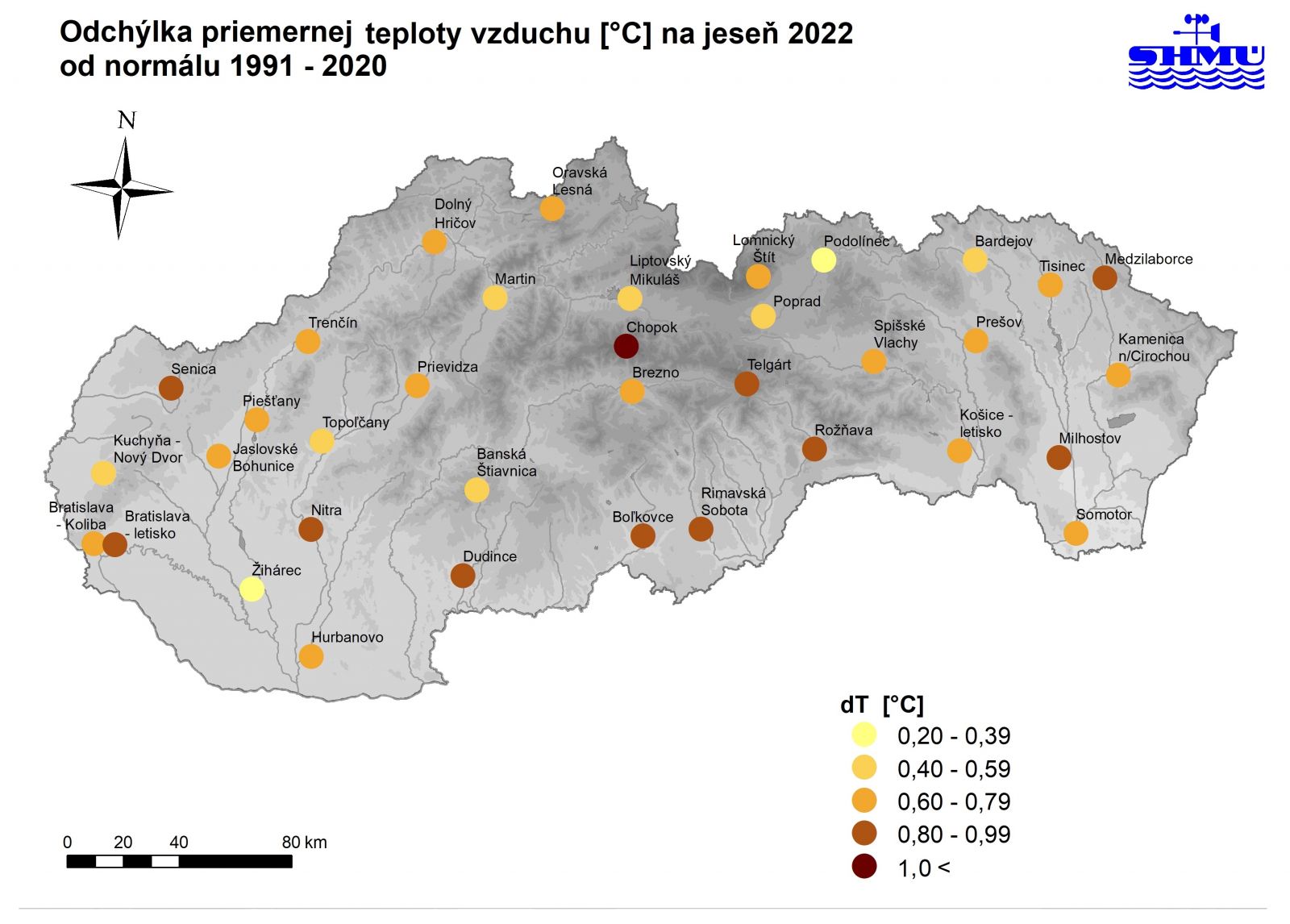 Najvyššiu teplotu vzduchu (jeseň) sme zaznamenali v Bratislave na letisku 11,8 °C s odchýlkou +0,9 °C od 1991 – 2020 (6. najteplejšia jeseň aspoň od roku 1931). Priemerná odchýlka pre územie Slovenska bola +0,6 °C. Jednotlivé mesiace sezóny (jeseň) prispeli do celkového hodnotenia nasledovne.