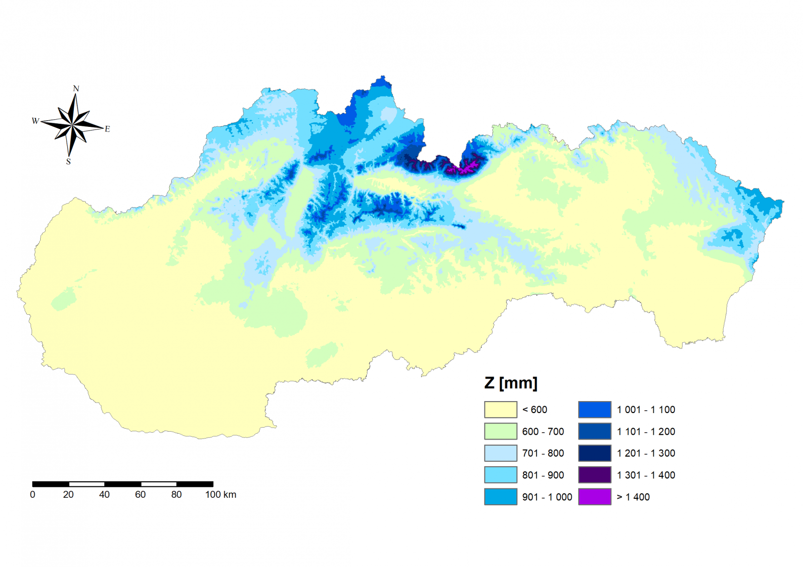 Obr. 3 Ročný úhrn atmosférických zrážok [mm] na Slovensku v roku 2022