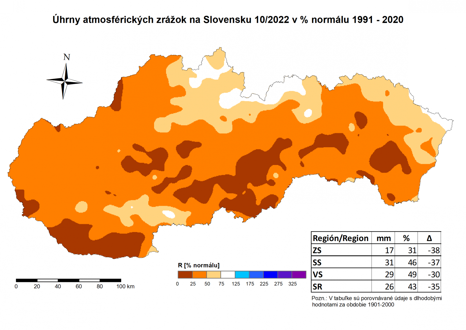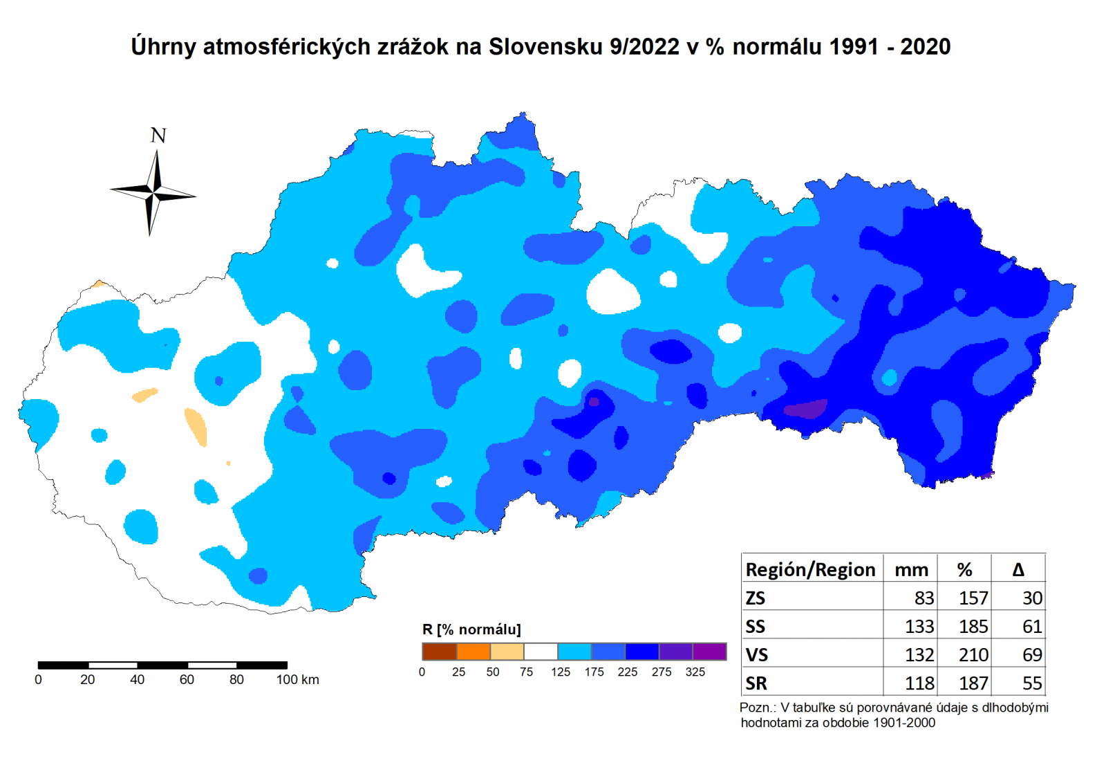 Obr. 5 Príklady mimoriadnych nadnormálnych a podnormálnych úhrnov atmosférických zrážok na území Slovenska v septembri a októbri 2022 v percentách mesačného normálu 1991 – 2020