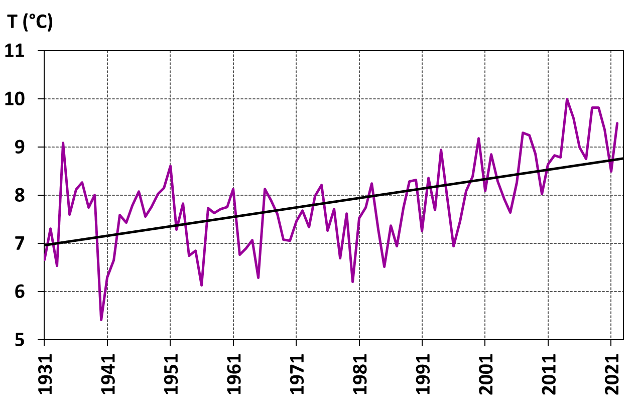 Obr. 2 Priestorová priemerná ročná teplota vzduchu s vyznačenou lineárnou trendovou spojnicou v období 1931 - 2022 na území Slovenska
