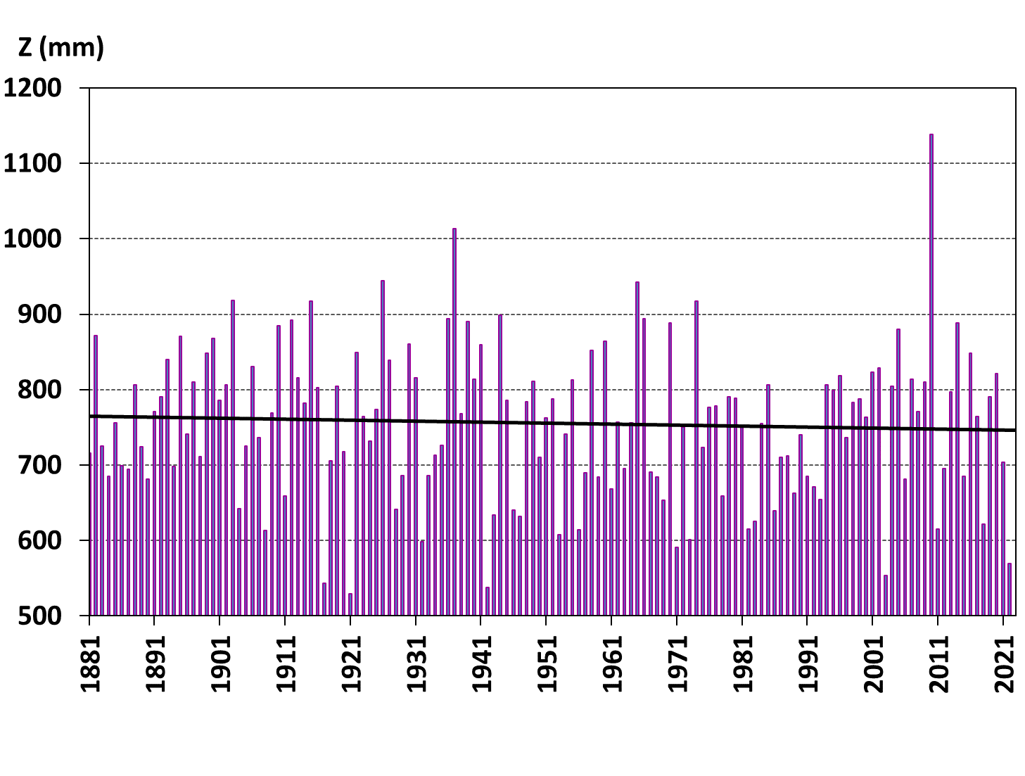 Na základe priestorového ročného úhrnu atmosférických zrážok vypočítaného metódou dvojitého váženého priemeru bol rok 2022 piaty najchudobnejší na zrážky od roku 1881 s hodnotou 569 mm. Mal iba o niekoľko milimetrov viac zrážok ako rok 2003, ktorý na konci jari a v lete bol podobne mimoriadne teplý, s nedostatkom zrážok a suchom, ako rok 2022.
