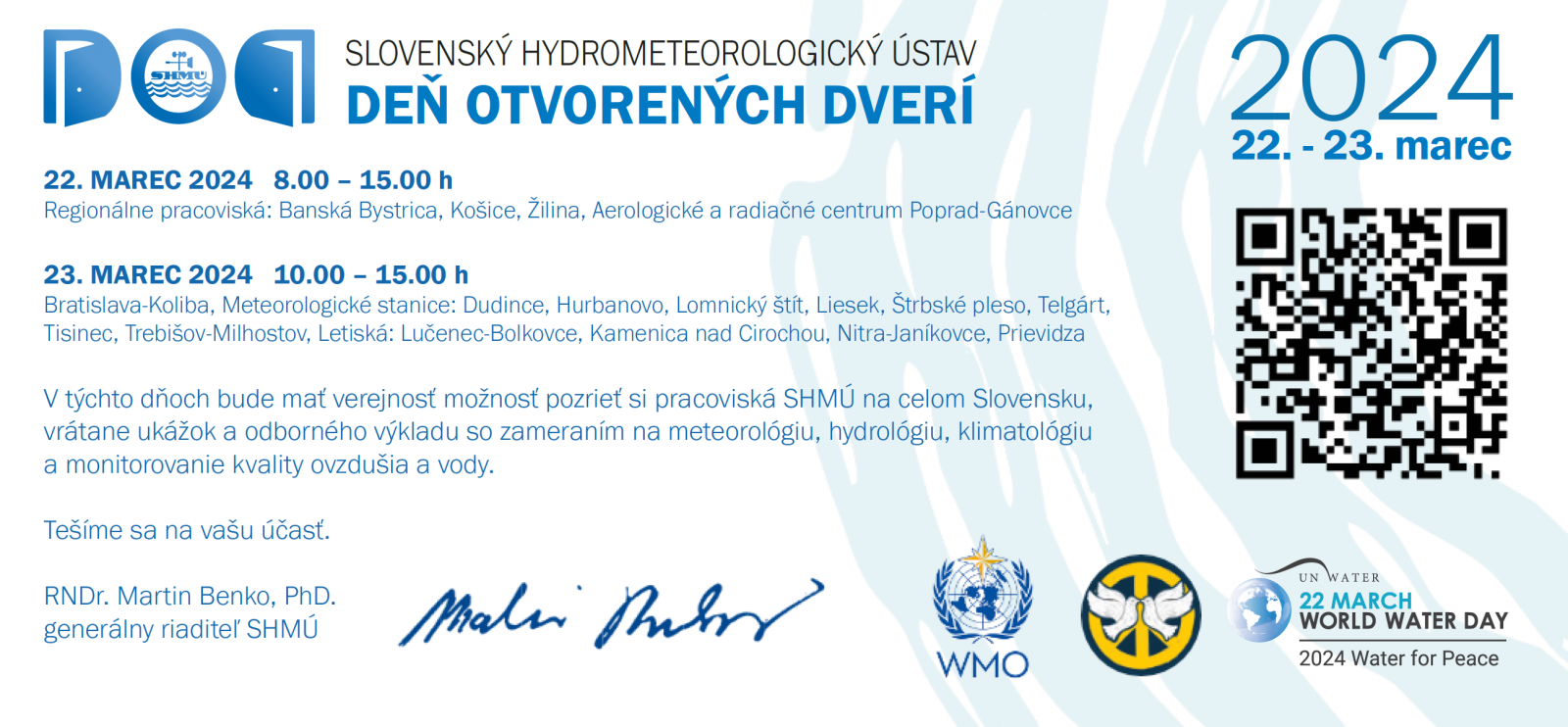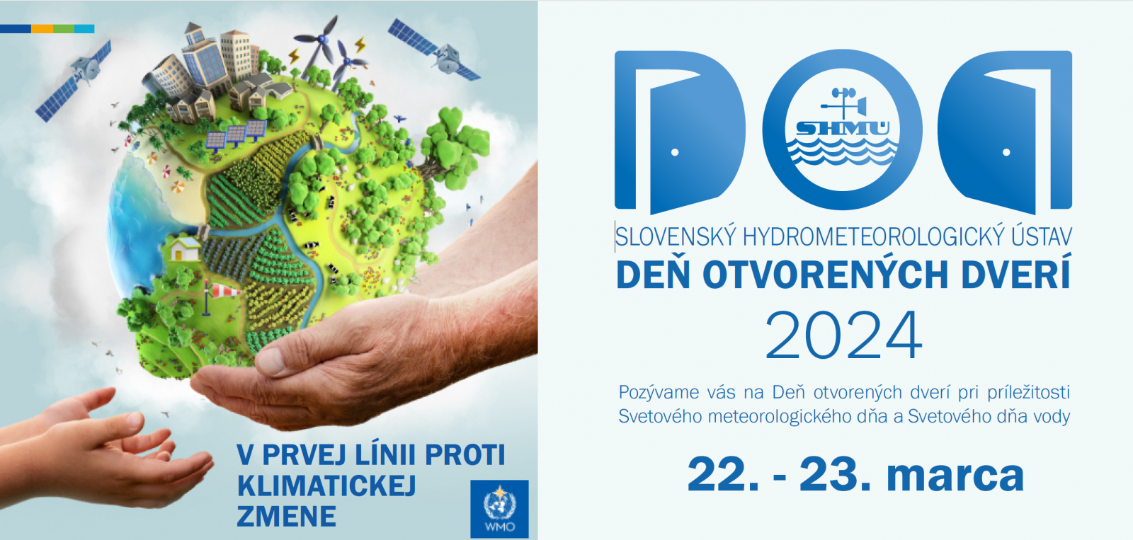Pozývame vás na Deň otvorených dverí 2024. Uskutoční sa v piatok 22. marca na regionálnych pracoviskách v Banskej Bystrici, v Košiciach, v Žiline a na Aerologicko-radiačnom centre Poprad-Gánovce a v sobotu 23. marca v Bratislave, na meteorologických staniciach: Dudince, Hurbanovo, Lomnický štít, Liesek, Štrbské pleso, Telgárt, Tisinec, Trebišov-Milhostov a na letiskách: Lučenec-Bolkovce, Kamenica nad Cirochou, Nitra-Janíkovce, Prievidza.