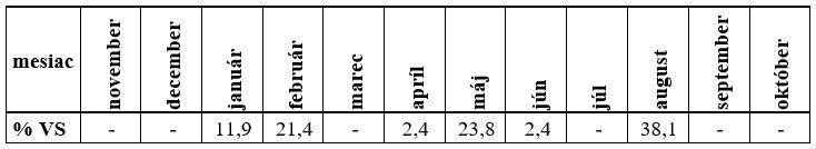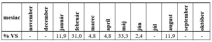 Kulminačné prietoky sa najčastejšie vyskytovali v auguste (38,1 %), máji (23,8 %) a februári (21,4 %) (Tab. 8).