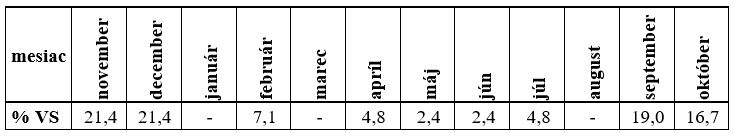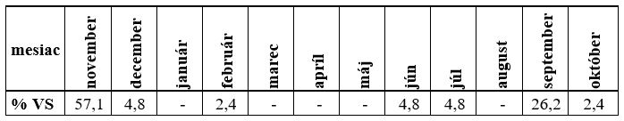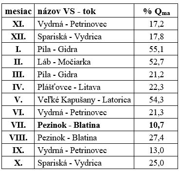 Minimálne priemerné mesačné prietoky boli najčastejšie dosiahnuté v hodnotených VS v mesiaci november 2022 (Tab. 2). V tabuľke uvádzame časový výskyt minimálnych priemerných mesačných prietokov, s uvedením percentuálneho podielu počtu hodnotených VS s výskytom minimálnej hodnoty Qm v jednotlivých mesiacoch HR 2023.