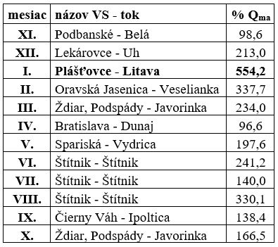 V Tab. 3 uvádzame maximálne relatívne hodnoty priemerných mesačných prietokov (Qm/Qma (%)) v jednotlivých mesiacoch hydrologického roka 2023 spolu s názvom VS a toku, kde bol dosiahnutý. Ako vidieť z tabuľky, najčastejšie boli maximálne relatívne hodnoty priemerných mesačných prietokov dosiahnuté v hodnotených staniciach v povodí Váhu a Slanej (Tab. 2).