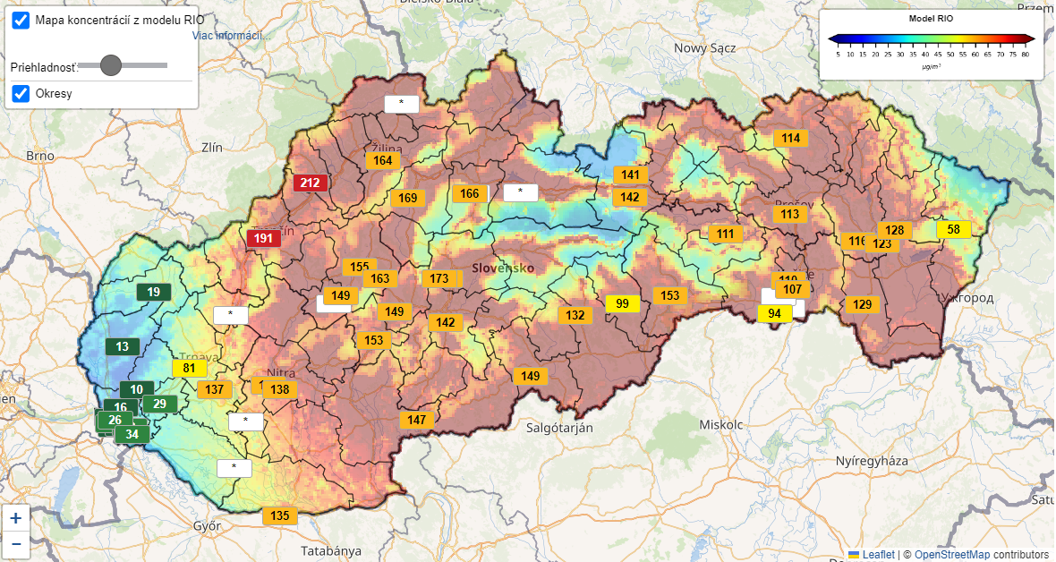 Aktuálne koncentrácie znečisťujúcich látok v ovzduší (namerané priemerné hodinové koncentrácie a výstup interpolačného modelu RIO)