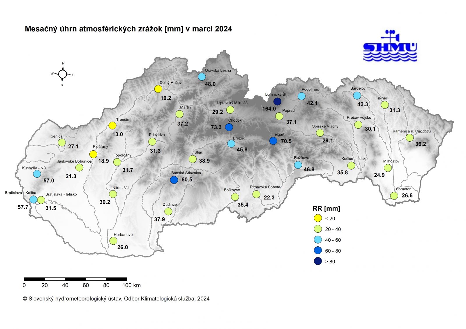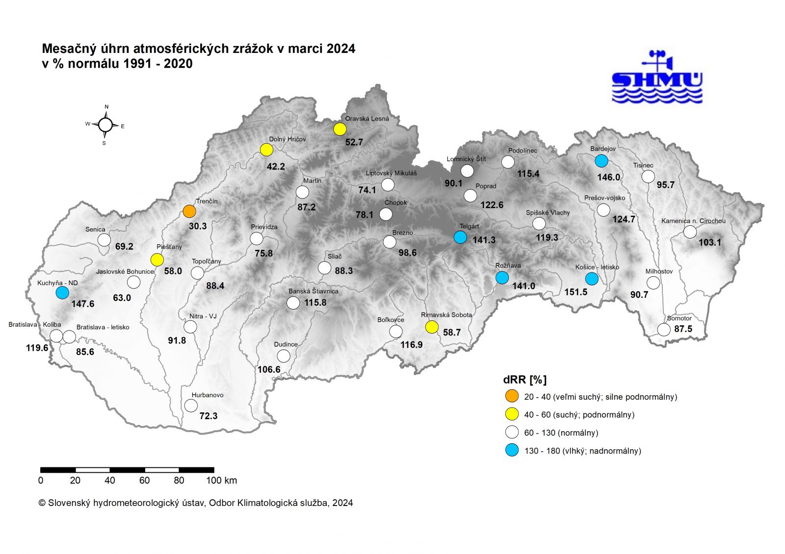 Marec 2024 bol na väčšine územia Slovenska zrážkovo silne podnormálny (veľmi suchý) až nadnormálny (vlhký). Percento normálu 1991 - 2020 mesačného úhrnu zrážok bolo najvyššie 151,5 % v Košiciach a najnižšie 30,3 % v Trenčíne. Najnižší mesačný úhrn bol 13,0 mm v Trenčíne. Pod hranicou 20 mm bol mesačný úhrn zrážok aj na staniciach Žilina 15,8 mm, Lenartovce 17,6 mm, Piešťany 18,9 mm, Dolný Hričov 19,2 mm a Vysoká 19,5 mm. Najvyšší mesačný úhrn zrážok bol v Jasnej 147,0 mm. Nad 80 mm bol mesačný úhrn zrážok aj na staniciach Králiky 121,4 mm, Harmanec 107,2 mm, Vyšná Boca 102,2 mm, Donovaly 98,2 mm, Stratená-Dobšinská Ľadová Jaskyňa 91,9 mm, Klenov 91,2 mm, Martinské hole 90,4 mm, Motyčky 84,7 mm, Vyšná Slaná 83,1 mm, Javorina 81,6 mm a Muránska Zdychava 80,5 mm.